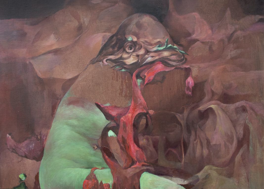 Le cinque artiste non condividono solo la comune esperienza della residenza artistica a Palazzo Monti ma anche un vasto immaginario in grado di dare vita ad atmosfere oniriche, a tratti fiabesche. Eppure, non sono tutte favole quelle che vengono raccontate in “Upon a Time”, come i ritratti di Sahara Longe (1994), dove ad ambientazioni e soggetti, ad un primo impatto familiari, corrisponde una composizione asciutta in cui si stagliano le sagome di protagonisti nuovi in grado di ribaltare una storia dell’arte completamente occidentale. Così le opere di Sophie Spedding (1995), dando spazio alla corporeità e le sue manifestazioni in maniera invadentemente sincera, sembrano servirsi di una realtà altra per esplorare la persistenza delle rappresentazioni mentali. Attraverso una pittura dai toni intensi, Daria Dmytrenko (1993) esplora la dimensione psicologica dell’individuo sostando nel limbo tra sogno e realtà; un terreno di ricerca analogo a quello di Carla Giaccio Darias (1998), i cui lavori indagano i processi di attivazione della memoria attraverso la raccolta delle immagini. La pratica di Bea Bonafini (1990) richiama, invece, mitologia e storia popolare in un intreccio di figure ibride che si fondono l’una con l’altra creando collage di forme dai colori delicati, nondimeno capaci di trasmettere efficacemente il tenore della rappresentazione.