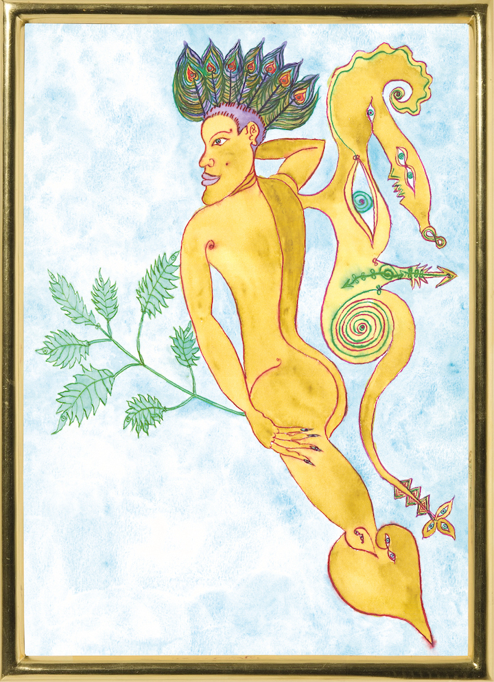 Tutto è elegantemente calligrafico, esotizzante di arzigogoli. Gli arti dei ragazzi ritratti si metamorfizzano in zampe di Ganesha, in uova dorate, in foglie di ontano, in code di tritone. Anche il fiore sensuale dell’Alam Jiwa, da cui l’esposizione prende il titolo e di cui Ontani adorna una serie unitaria di 18 acquerelli, è trasfigurazione di se stesso. […]