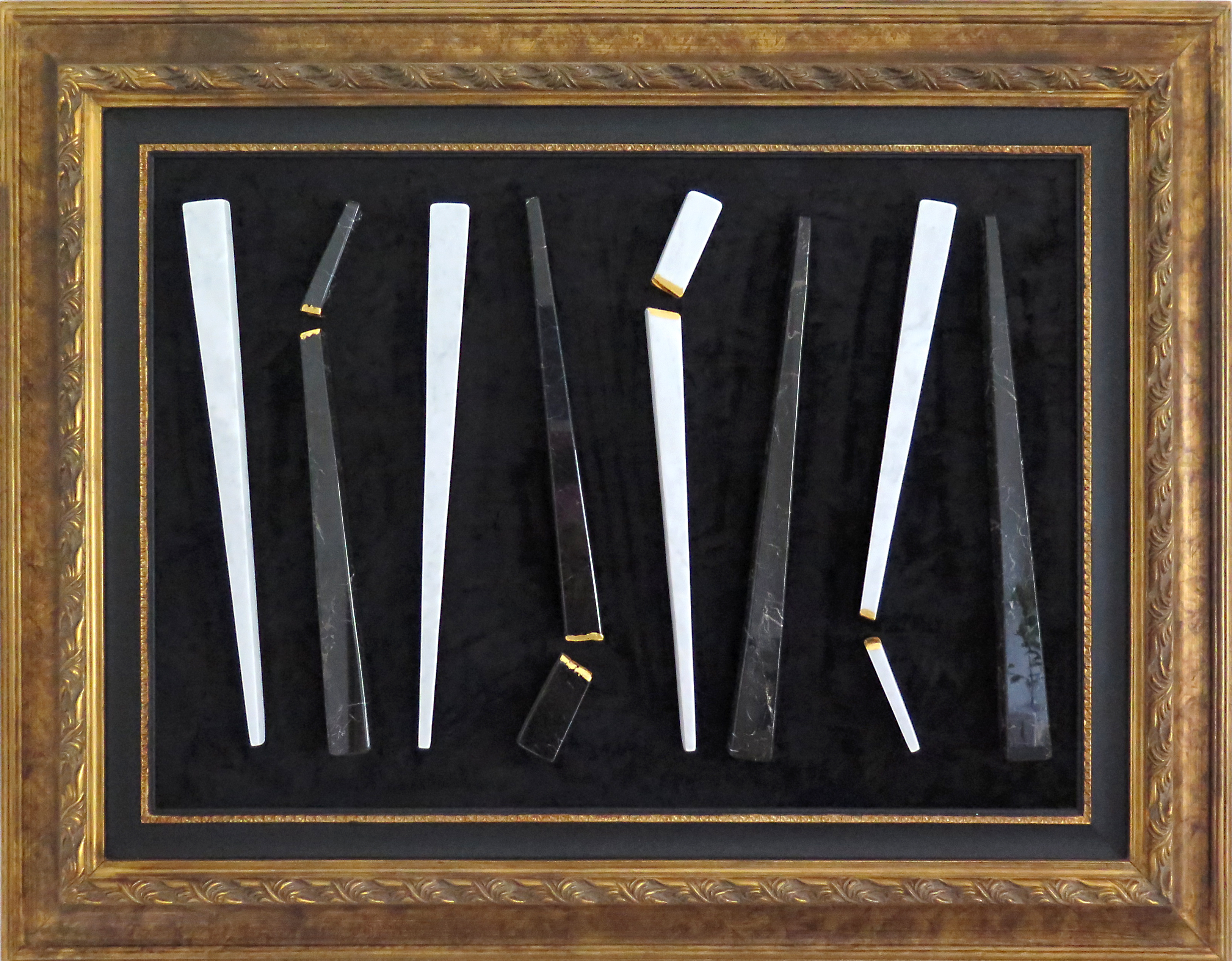 L’artista, protagonista della scultura italiana contemporanea con un forte senso della materia e del colore, lavora la pietra. Nelle opere Bladelight utilizza il marmo, che lavora e traduce in elementi scultorei acuminati, facendogli perdere corpo e peso per acquisire leggerezza simbolica grazie alle installazioni in sospensione e su base. Seguendo i capisaldi della scultura – il pieno e il vuoto, il geometrico e l’indefinito, l’intero e lo spezzato – Gioni David Parra ne sottolinea i tratti topici utilizzando la foglia d’oro, che trascende la sua classica accezione decorativa. Scrive Luigi Codemo nel saggio in catalogo che accompagna la mostra: «Ancora oggi le statue stele testimoniano simboli e narrazioni che attraversano le generazioni come archetipi introiettati. E se le opere di Gioni David Parra inserite accanto a queste antiche sculture suscitano un senso di consonanza così forte non può che essere per il riferimento ad un codice semantico che, per quanto ancestrale, risulta ancora condiviso. Innanzitutto, le stele condividono una verticalità ipnotica: presenze che ti si parano davanti congiungendo terra e cielo, rivelando una forza tellurica che s’innalza e si lega a quella celeste. E tutto avviene secondo il principio della massima essenzialità: gli antichi scultori per ottenere la massima efficienza da strumenti rudimentali, l’artista contemporaneo per ricercare la massima sintesi attraverso l’astrazione. Ed è, infatti, l’astrazione il principio che guida la ricerca formale di Parra mentre fa sue le leggi della pietra e si addentra nella grammatica di archetipi e simboli antichi. Le tre stele Bladelight, le Lame di luce dalla sagoma triangolare, richiamano un simbolo assiale, ovvero la spada, il lampo, la luce che s’infila nella terra segnando il centro che muove e domina il cosmo rimanendo fermo, il perno della ruota, il motore immobile».
