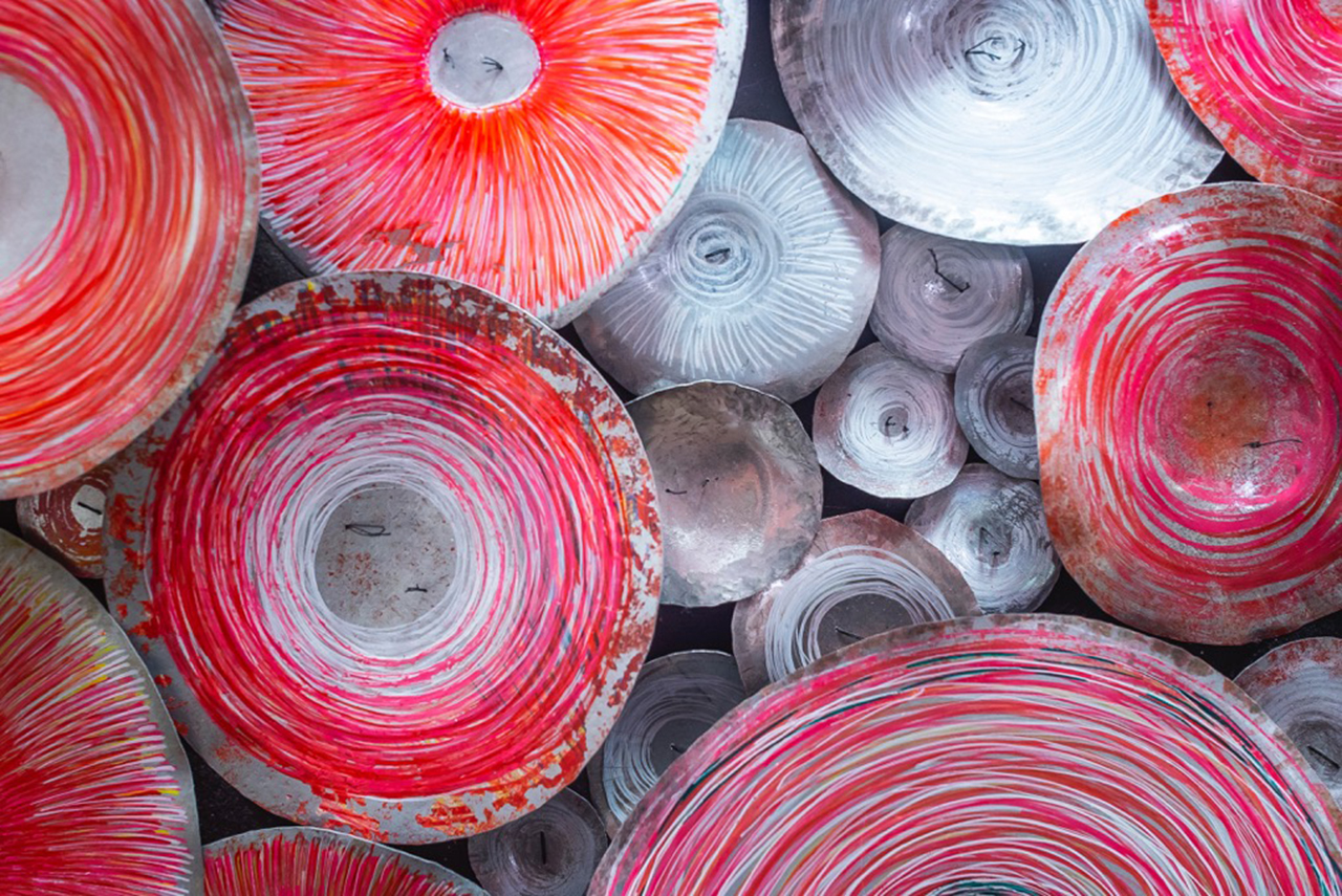 «La mostra si può descrivere come un’installazione di lavori recenti, due grandi “arazzi”, in realtà ricami su piattina di polietilene stabilizzata, un materiale plastico molto comune che si adopera nel giardinaggio, dedicati rispettivamente all’acqua e al fuoco, un’onda e una fiamma, distruttive entrambe ma anche rigenerative. Ci sono poi una trentina di opere in lamiera, materiale anomalo nella scultura anche contemporanea e anche per questo più interessante da proporre in questo centro dedicato specialmente alle ricerche plastiche o comunque pensate “nello spazio”. Sono elementi circolari colorati, dischi che ricordano i fiori di ninfea, e personaggi dall’aspetto arcaico e austero in forma di stele; la lamiera industriale, in apparenza così fredda ed estranea alla scultura, viene completamente alterata dall’artista che attraverso un lungo e faticoso procedimento analogo a quello necessario alla preparazione dei piatti musicali, che si usano nelle orchestre e nelle percussioni moderne, li rende sensibili alla luce e ricettivi alla patina colorata».