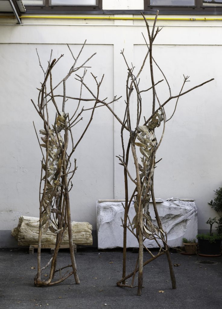 Nell’assenza di mitologia dei lavori di Penone, la narrazione sposta il suo asse, e il rapporto tra tempo naturale e passato storico dà vita a un nuovo presente incerto. Così, nelle sale caratterizzate da un tripudio di marmi, sculture e decorazioni, l’artista aggiunge un innesto organico di foglie, cuoio, legno che collega e definisce gli universi di Arte e Natura. Nei Giardini invece, l’integrazione guarda al mondo dei metalli, con sculture in bronzo che dialogano con la ricca vegetazione circostante, arricchita da circa quaranta nuove piante in vaso chiamate a sorreggere alcune opere.