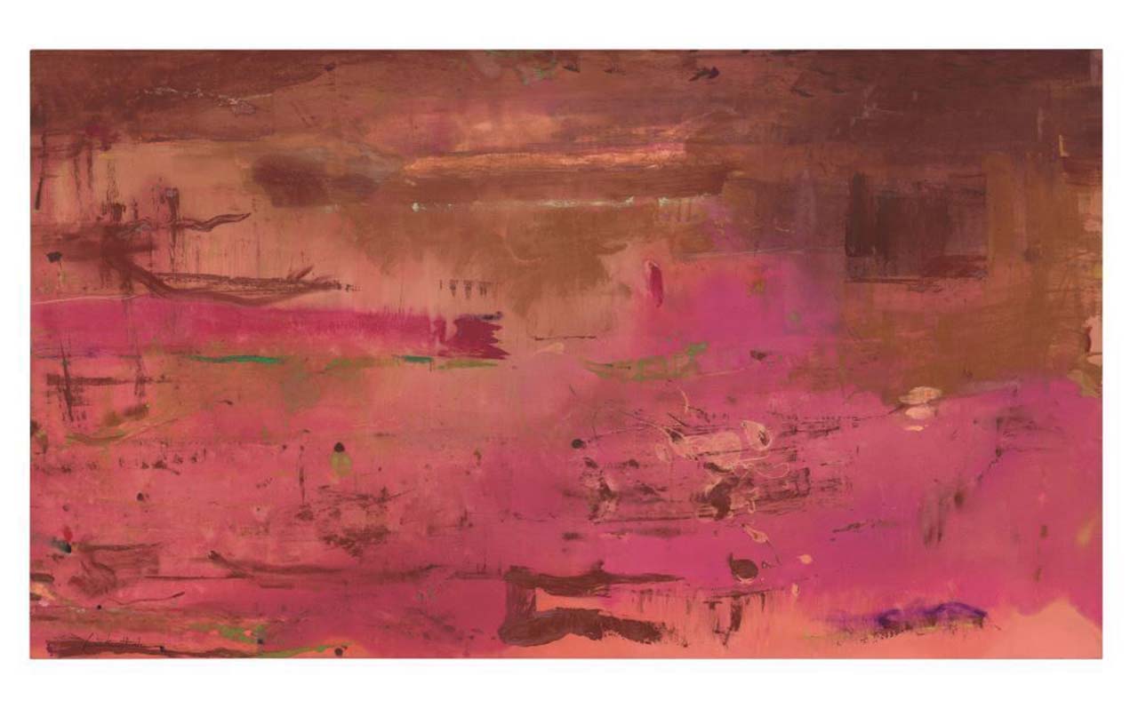 In alto: Helen Frankethaler, Dream Walk Red, 1978, Acrilico su tela, 59 x 103 1/2 in, 149.9 x 262.9 cm. © 2019 Fondazione Helen Frankenthaler, Inc./Artists Rights Society (ARS), New York, Foto: Rob McKeever, Courtesy Gagosian