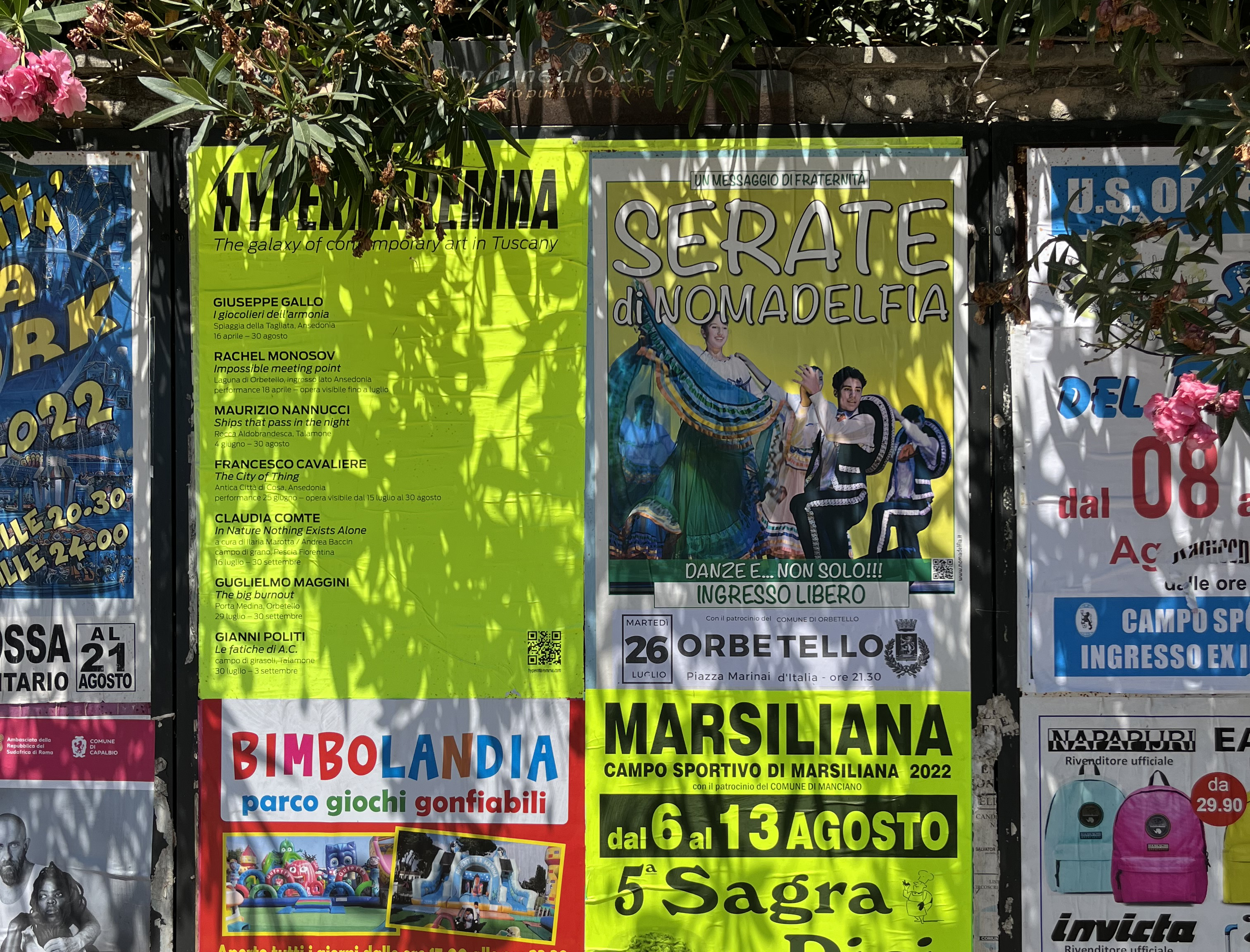 Le fatiche di A.C., invece, è il progetto ideato e realizzato da Gianni Politi «che mette in relazione la sua infanzia con il suo percorso professionale. Il territorio della Maremma e la costa dell’Argentario sono i luoghi in cui Politi è cresciuto fin da quando era bambino e che considera casa. Per Hypermaremma, l’artista ha dipinto dieci vele da windsurf che, inizialmente, sono posizionate in un campo di girasoli a Talamone, come dei monoliti che si liberano alle correnti ventose della baia. Le vele saranno successivamente attivate da un’azione performativa con cui l’artista rievoca il tragitto che sua madre compiva per accompagnarlo da casa alla scuola di windsurf: a settembre infatti avrà luogo una regata di dieci windsurf che da Porto Santo Stefano arrivano fino a Talamone in una sorta di danza, una coreografia tra vento e colore accompagnata dal pubblico da terra, mentre percorre la spiaggia della Giannella», hanno proseguito i curatori.