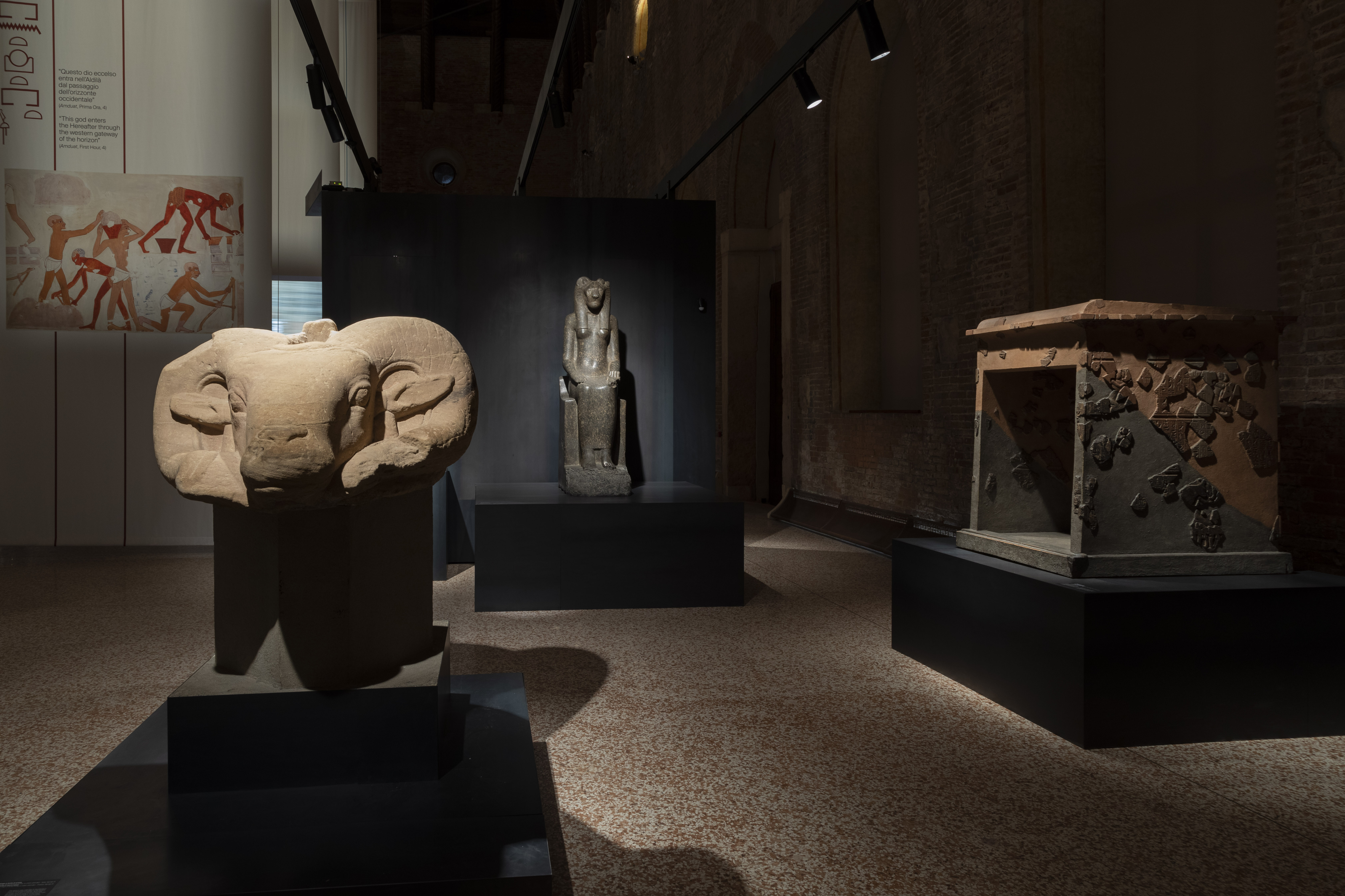 «Il percorso espositivo, nel salone sotto la copertura a carena di nave rovesciata della Basilica, è diviso in due ampie sezioni, hanno spiegato gli organizzatori. La prima illustra la vita terrena e la creazione dei capolavori millenari arrivati a Vicenza attraverso tre capitoli. Deir el-Medina e l’occidente di Tebe racconta la più importante città d’Egitto all’inizio del Nuovo Regno, l’antica Tebe (oggi Luxor) e il piccolo villaggio degli operai. Le statue di Ramesse II, della dea Meretseger, della dea Sekhmet, il naos di Seti I, i frammenti e gli altri oggetti esposti narrano la fondazione e la particolare dimensione religiosa di questi due siti. La creazione del microcosmo presenta un focus sulla costruzione delle tombe, sulla loro struttura e decorazione, riportando strumenti, attrezzi e papiri con piante di edifici e studi di disegno.