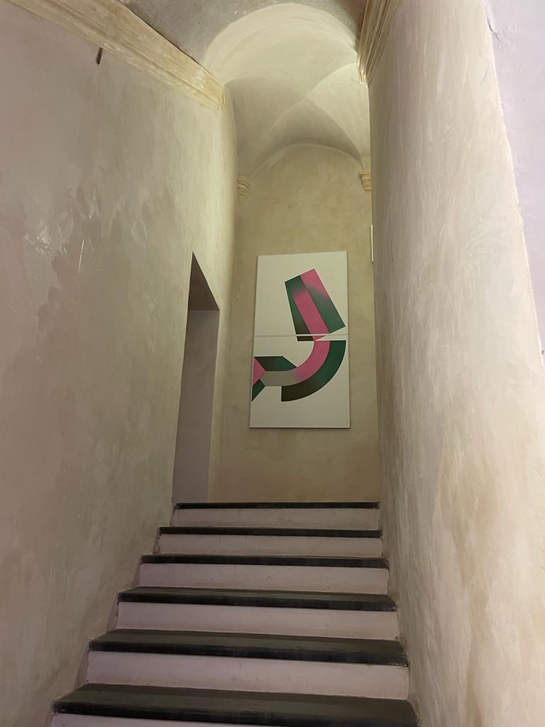 «Il percorso espositivo è articolato su più sale all’interno del seicentesco palazzo Doria a Borgomaro. Esso si dispiega principalmente tra le varie stanze del primo e secondo piano del palazzo. Le opere sono esposte singolarmente o a gruppi. La mostra suggerisce un percorso che parte dalle prime opere che riflettono sul corpo e le sue capacità tecniche e di movimento, per poi arrivare a opere poi più legate alla pittura e ad una riflessione su di essa in rapporto sia al corpo dell’artista che a quello del visitatore. Il percorso espositivo si delinea come un tragitto suggerito all’interno di un mondo di colori e sensazioni tattili che vuole essere scoperto da ognuno singolarmente: non c’è un solo modo di vedere la mostra. Esso cambia per ogni spettatore. Questa è, a mio avviso, la singolarità dell’arte contemporanea che viene enfatizzata nel percorso espositivo. “Il Grande Brivido” è dunque una mostra tutta da scoprire facendone esperienza in prima persona».