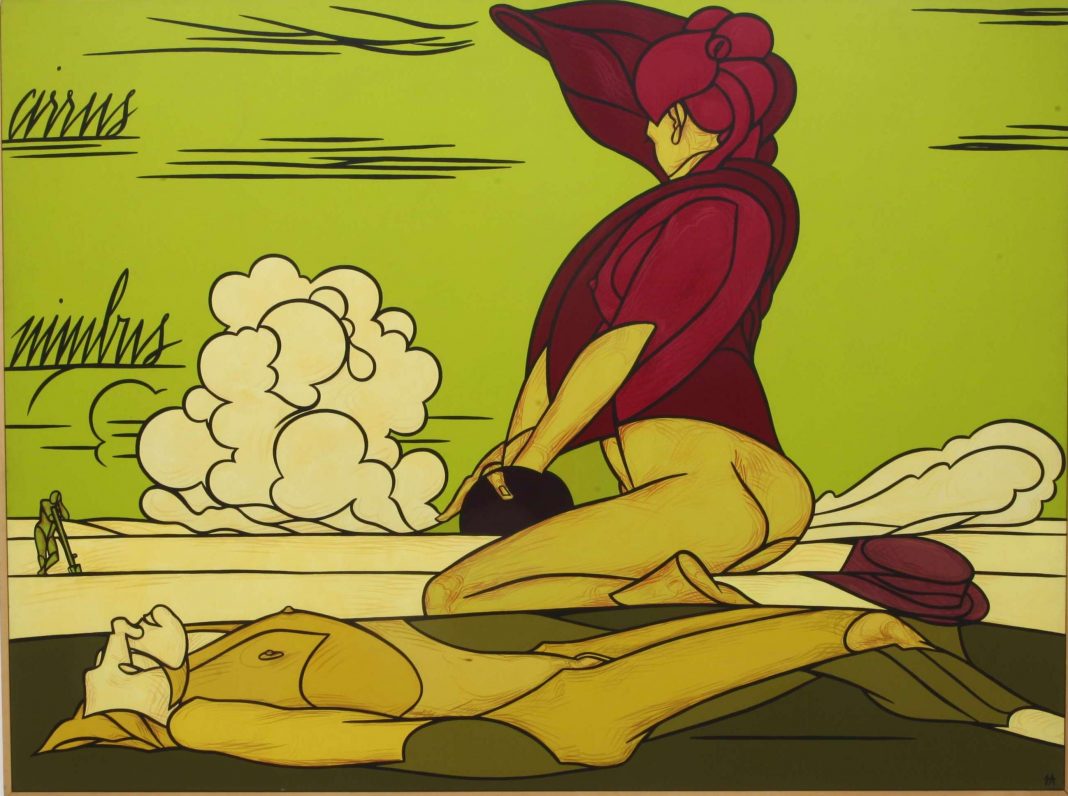 «La vicenda internazionale di quegli anni si ritrova nelle esperienze di Adami stesso, nato nel 1935 a Bologna, e oggi residente tra Parigi, sua città d’elezione e il Lago Maggiore. Diplomato all’Accademia di Brera nel 1955 e poi in viaggio attraverso l’Europa, gli Stati Uniti, l’America Latina e l’India, Adami unisce a questi stimoli la fascinazione per la pittura di Oskar Kokoschka e di Francis Bacon, del Surrealismo e di Giorgio De Chirico, attingendo all’ondata pop inglese e americana e sviluppando presto una sua originale figurazione sintetica e frammentata, giocata su campiture piatte, definite attraverso un segno-disegno tagliente. Così Adami “ritaglia” netti contorni neri senza chiaroscuro e, come un montatore cinematografico, inserisce nell’opera parole e sigle», ha proseguito la galleria.