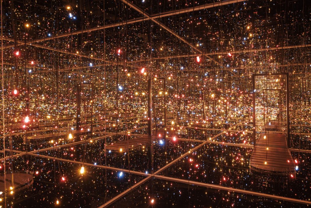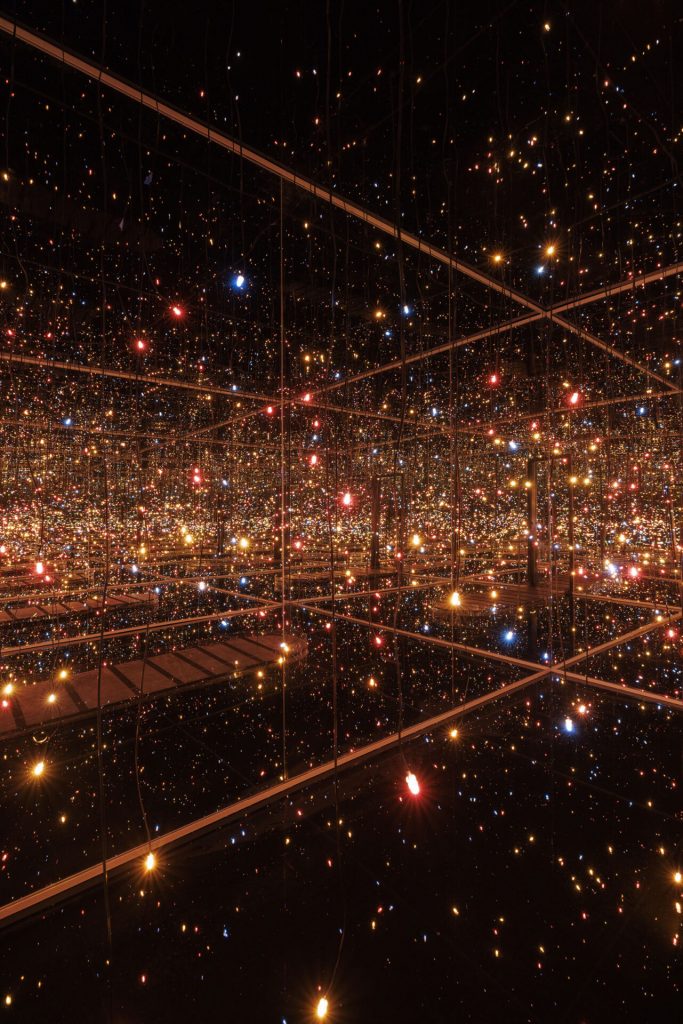 Kusama nasce nel 1929 e nel 1952 inizia a esporre le sue opere, rendendosi conto che il Giappone è troppo piccolo, servile, feudale. Bisognosa di una libertà infinita e di un mondo più ampio si fa strada in lei il desiderio di trasferirsi in America. Nel 1965, quando già lavorava con le tematiche dell’infinito, della self-obliteration e dell’accumulo, presenta la sua prima Infinity Mirror Room: basandosi sul concetto di ripetizione e utilizzando uno specchio per ottenere una moltiplicazione all’infinito consente, come mai aveva fatto prima, di entrare fisicamente nel suo mondo.