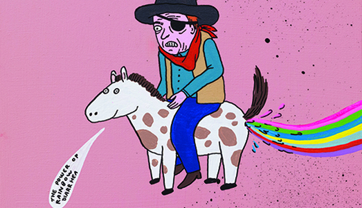 In alto: Laurina Paperina, John Wayne and the pony, 2017, smalti all’acqua markers e spray su legno, 20×25 cm