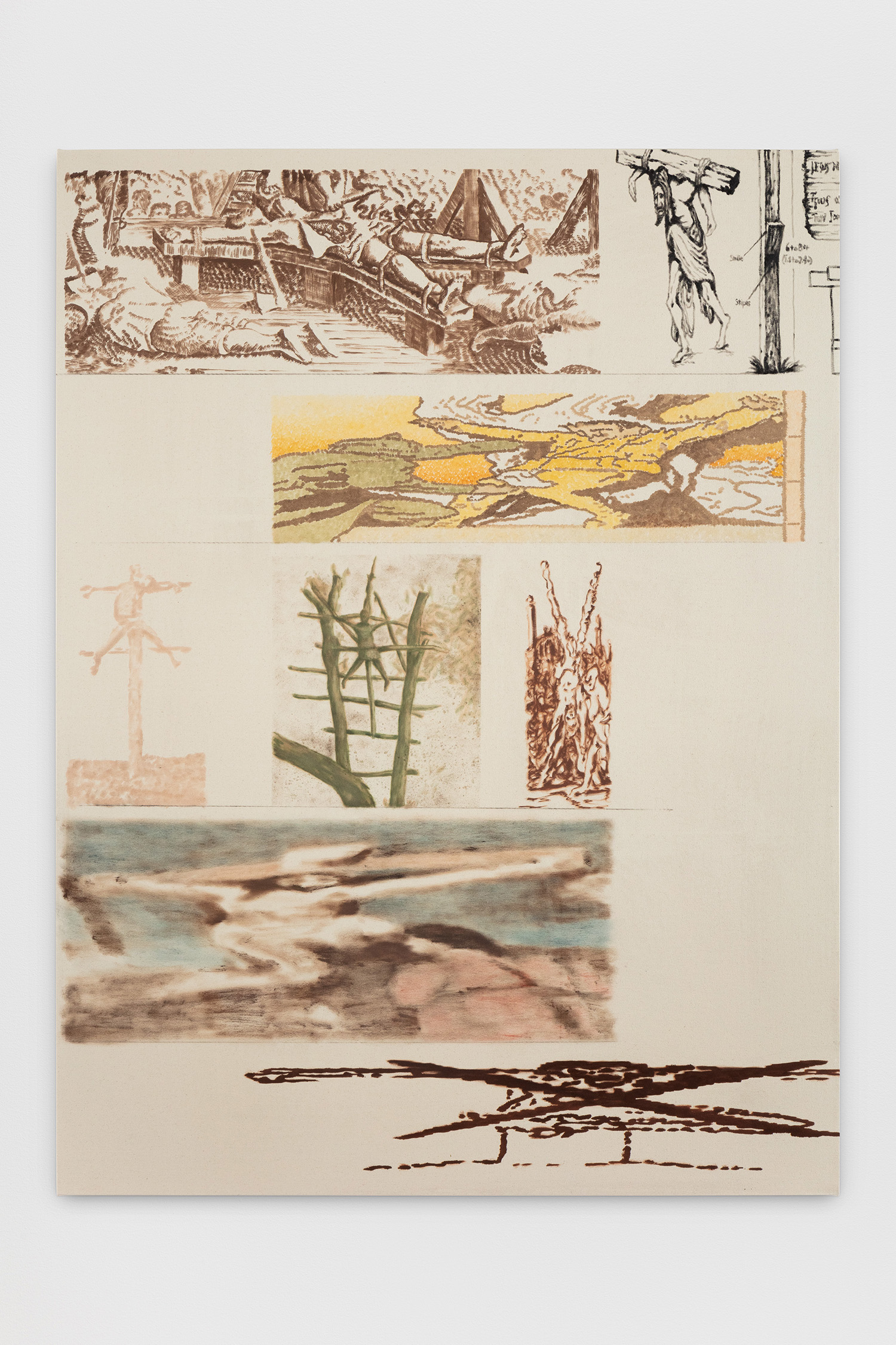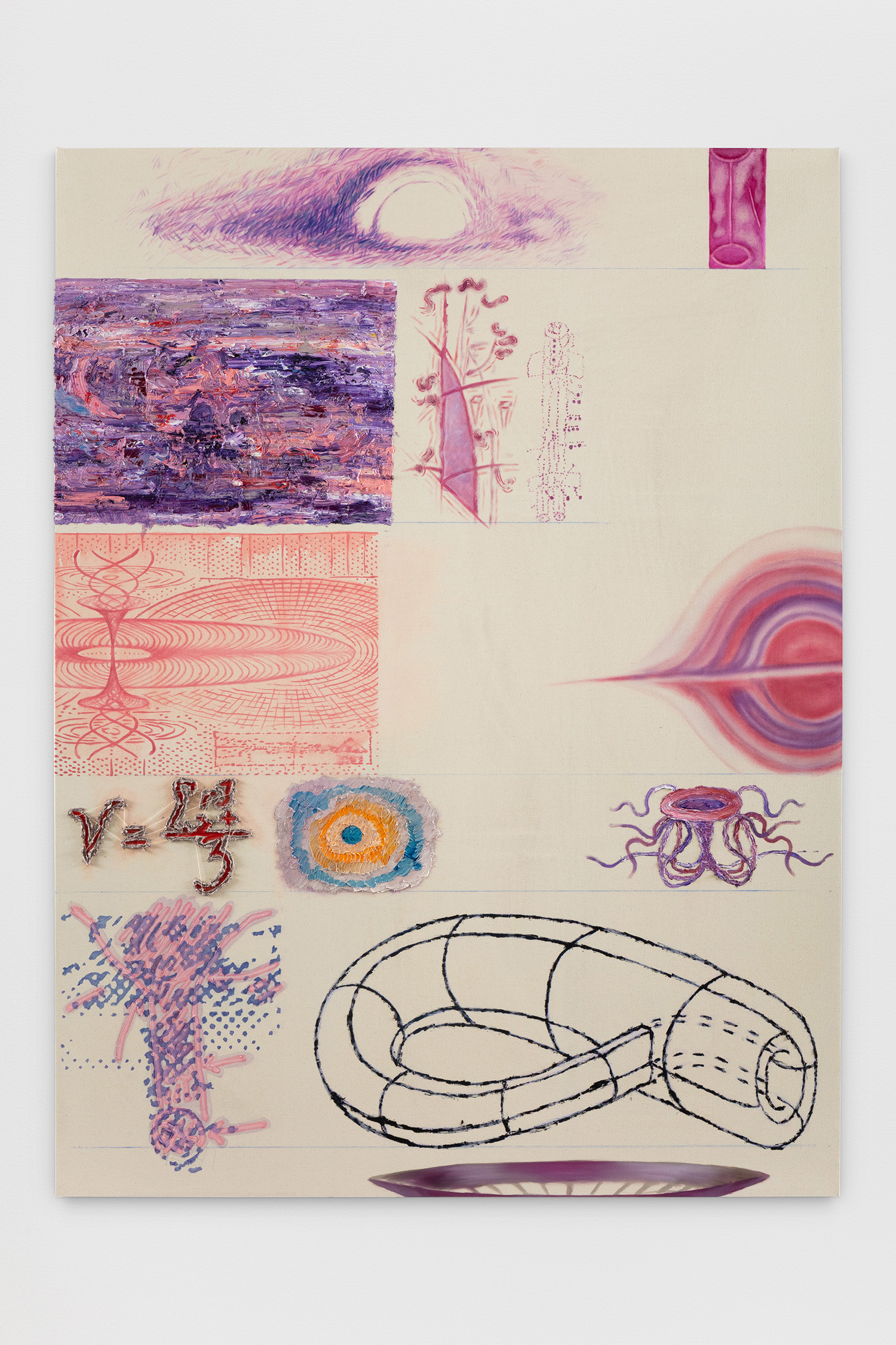 «La mostra “Liquid Products and Frozen Form” di Joshua Miller presenta sette dipinti tutti realizzati ad olio su tela con la stessa misura (183 × 138 cm) che accompagnano lo spettatore in un percorso che, esplorando la fenomenologia del linguaggio visivo, assume la forma di un atlante dell’immagine che racconta la storia della pittura. Con le parole dell’artista «C’è un personaggio centrale in questi dipinti, ed è la pittura o il linguaggio stesso. È come se esistesse un essere che indossa molti abiti e parla a più voci per raggiungere il suo obiettivo: la comunicazione. La storia narrata è “la storia della pittura».