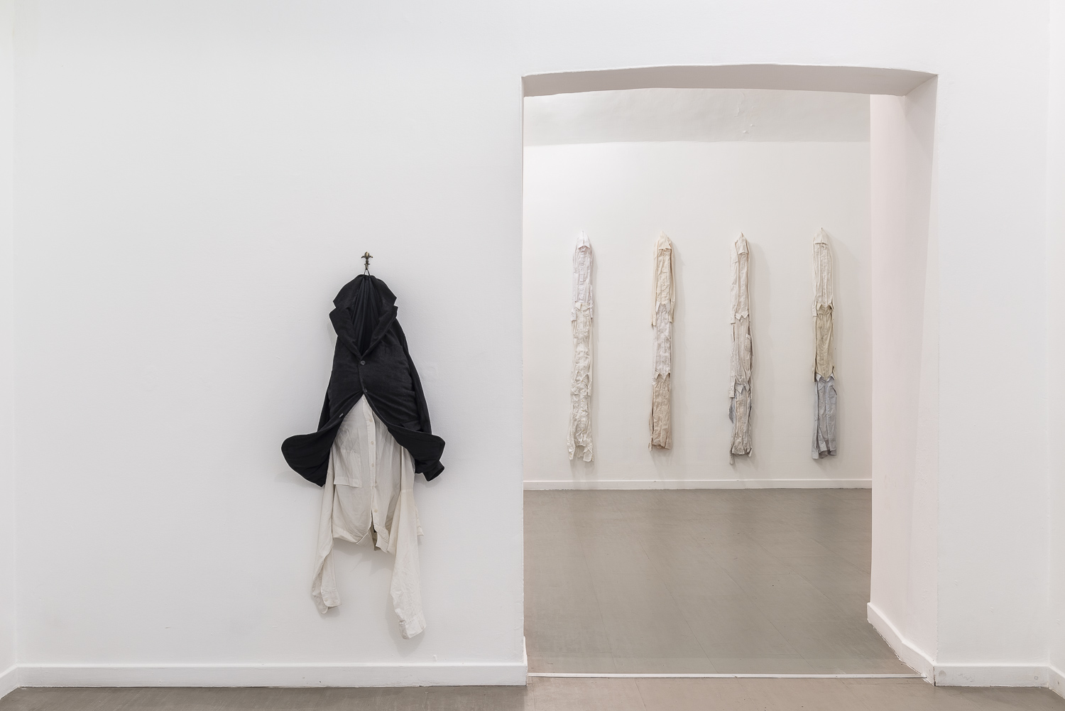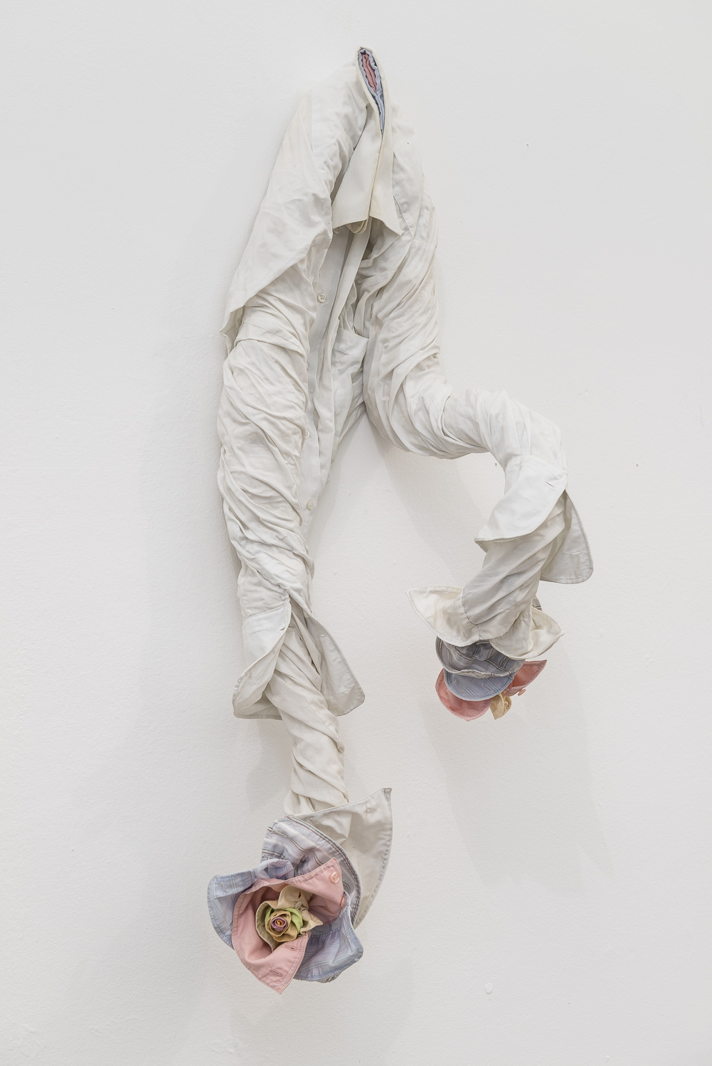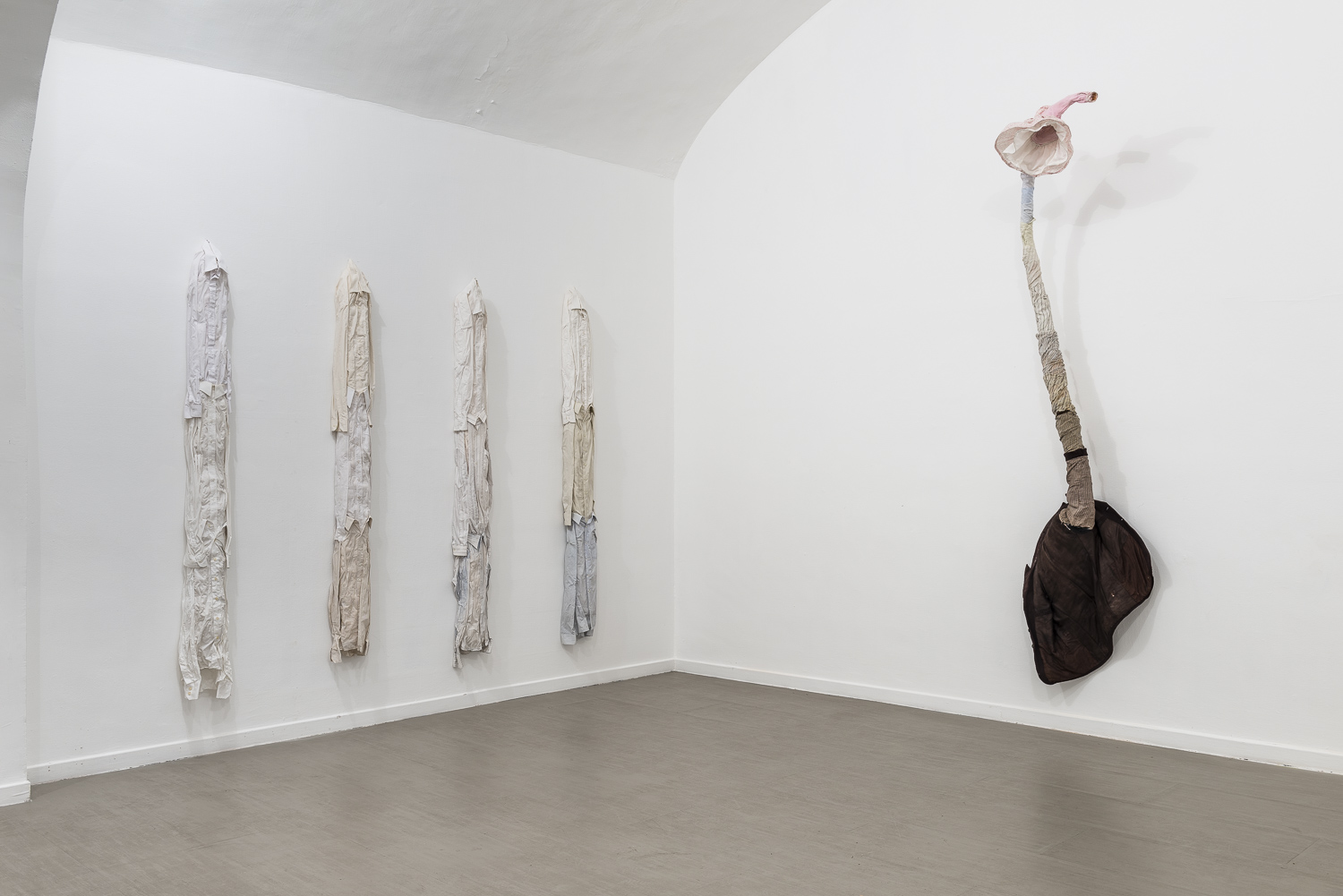 «Oltre ai lavori di cui ho appena parlato, in mostra ci sono alcune nuove opere e sculture realizzate appositamente per lo spazio con l’affascinante soffitto a volta della galleria di Sara Zanin. In essi, sto esplorando i sentimenti di una sola persona. Come ci si sente ad essere un individuo unico, quali problemi psicologici o emotivi potrebbe avere una persona. Uno può avere alcuni problemi con l’esistenza stessa, oppure avere difficoltà nel relazionarsi con l’altro. Invece della massa, sto guardando all’individuo, isolato. Ognuna di queste nuove opere simboleggia una persona. Un lavoro intitolato I Can´t Help It è fatto di una camicia bianca. Le mani si allungano e fioriscono, sbocciando, rivelando la difficoltà di questa figura a celarle. Nonostante la meraviglia che scaturisce nel vedere delle mani fiorire, questa persona cerca di ritrarsi e nascondersi, non vuole che nessun altro si accorga della sua condizione perché preferirebbe essere proprio come chiunque altro. C’è poi un altro lavoro chiamato Why Should I Care?. Questa figura vive un conflitto interiore dato da una doppia identità personale, l’intera immagine esterna è presentata in contrasto con quella interiore, mostrandosi rivoltata a testa in giù, a significare un atto di rinuncia. Se lo si guarda più da vicino però, si potrà scorgere all’interno della giacca il vuoto, l’assenza non visibile dall’involucro esterno. E ancora, un’opera costituita da una giacca ricorda la forma di un pesce, con un cucchiaio d’argento al posto della testa. Il pesce e il cucchiaio hanno un significato personale per me, che trova spazio nei miei ricordi d’infanzia. Da bambina, non volevo mangiare nulla, fatto questo che mi rendeva molto magra, mia madre cercava dunque di nutrirmi costringendomi a mangiare zuppa di pesce imboccandomi con un cucchiaio. Ho detestato quell’esperienza. In questa mostra presenterò anche alcuni disegni con creature che ricordano degli uccelli. Questi uccelli sono come umani, con i loro problemi psicologici di personalità. Ad esempio, c’è un Memory Bird, ormai stanco di trasportare i pesanti ricordi legati all’infanzia…».