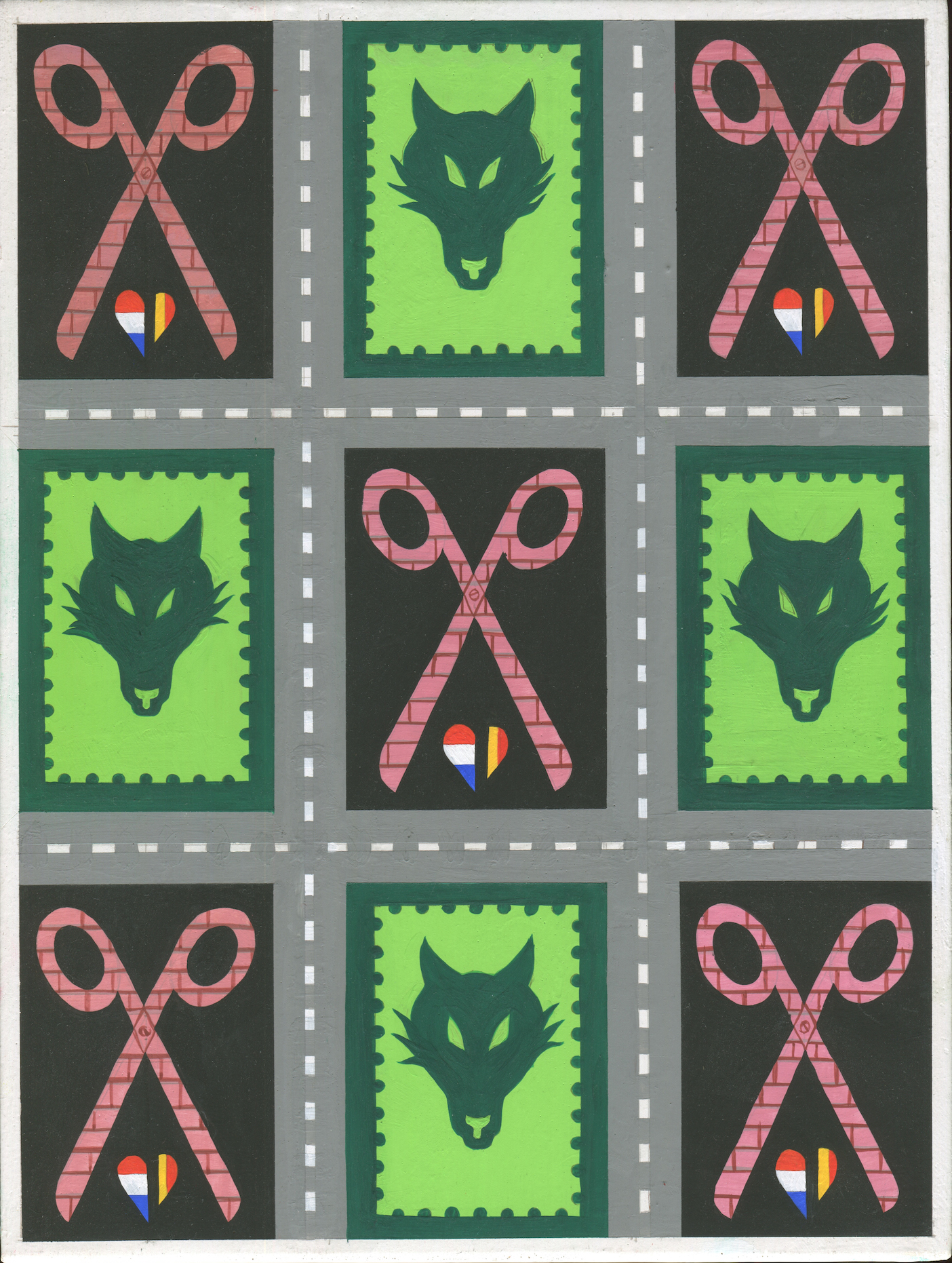 «Il lavoro di Bosmans intreccia riferimenti alla storia dell’arte e della cultura con temi di attualità socio-politica, sintetizzandoli in meticolose raffigurazioni simboliche che vengono inserite in environment immersivi. Le vicende che analizza – miti, racconti popolari e eventi recenti, sono traslati nel suo personalissimo lessico visivo che attinge alle stilizzazioni tipiche dell’araldica. L’alterazione della natura da parte dell’uomo è uno dei suoi temi d’indagine ricorrenti. Per esempio il fregio dipinto Wolf Corridors & Stamp Forest (2020), incluso nella Project Room, racconta per simboli un problema di ecologia: quello degli animali migratori, in salvo nelle riserve naturali ma impossibilitati a migrare, come fanno da millenni, a causa della gran quantità di arterie autostradali che tagliano in lungo e in largo le foreste d’Europa. Nella mostra alla Fondazione Pomodoro, quest’opera assume un ulteriore significato di riflessione sul tema dei confini politici e dell’impossibilità allo spostamento».