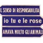 La mostra odierna al Padiglione d’Arte Contemporanea di Ferrara, nell’ambito della Biennale Donna, si muove su un doppio binario, tematico e cronologico: opere di anni diversi sono raccolte attorno al polo della parola, centrale nella fase verbovisiva, e a quello del gesto, che invece domina la produzione del decennio successivo. La fotografia, in particolare, diviene lo strumento dell’artista adeguato alla «lenta rievocazione della funzione del vedere libera da pregiudizi su ciò che è reale».