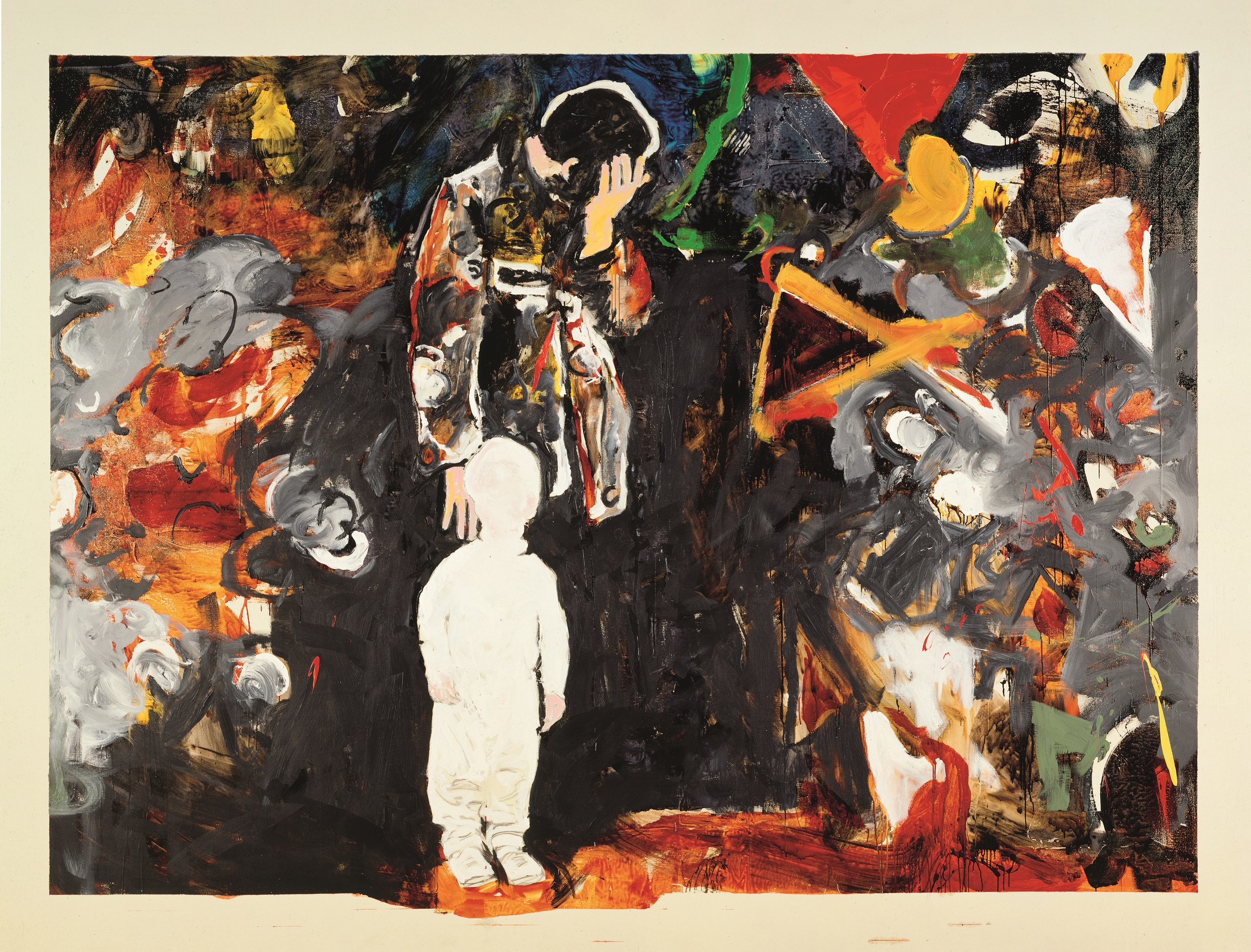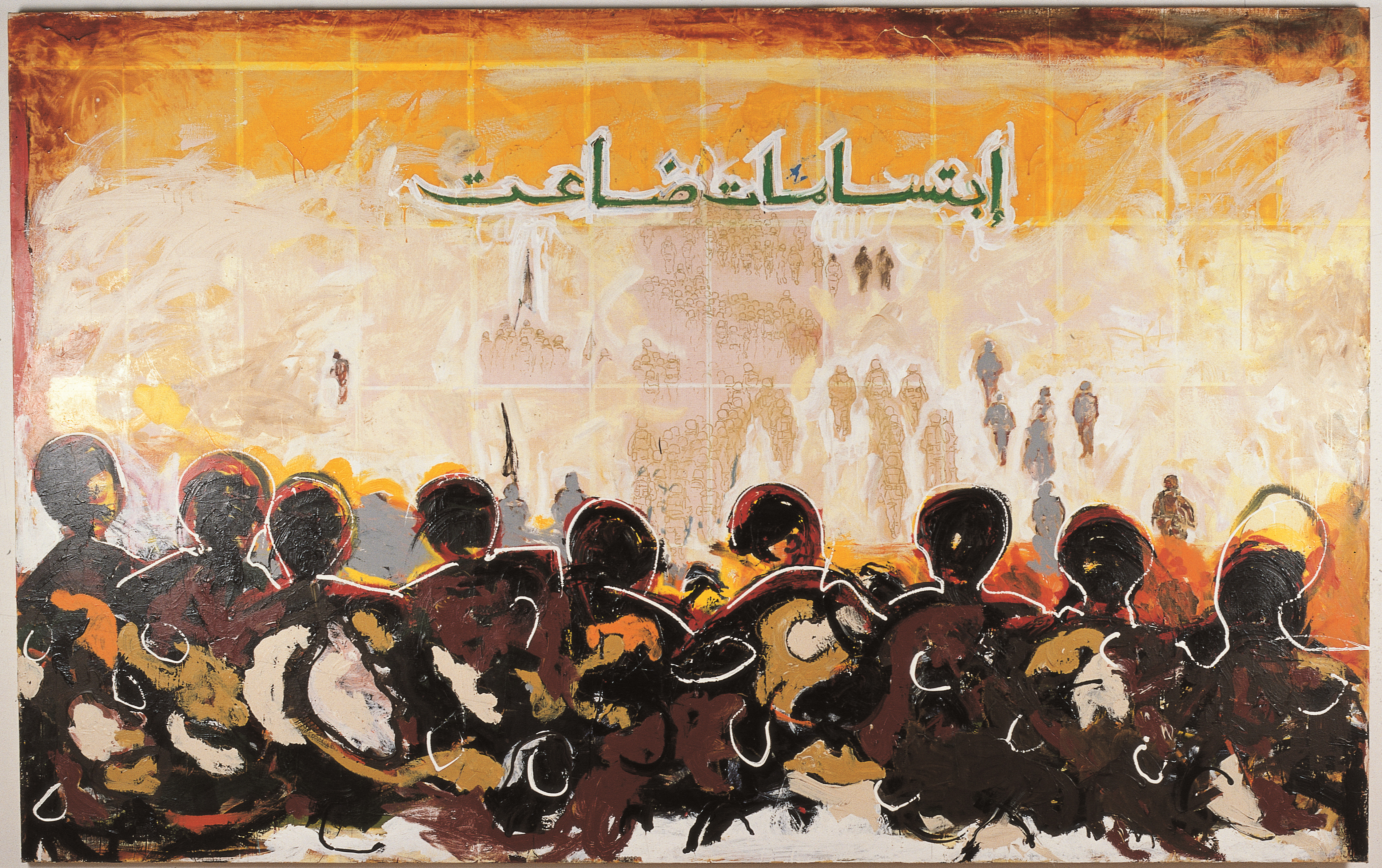 «Nei mesi drammatici che l’Europa sta vivendo oggi, appaiono di dolorosa attualità i “ritratti” della guerra in senso proprio che Schifano dedica alla crisi del Golfo. È un periodo, dalla fine degli anni ’80, in cui l’artista è particolarmente segnato dai media e dalla multimedialità. In anni di reclusione volontaria nella sua casa-studio, la televisione diviene per lui una finestra sul mondo e fonte ossessiva d’ispirazione. Rivolgendo la sua attenzione ai principali fatti di cronaca dell’epoca, della guerra ci restituisce uno sguardo proprio e struggente, declinato in opere imprescindibili del suo percorso. Nella sala principale dedicata alle esposizioni temporanee, sono presentate due opere monumentali dedicate al dramma della guerra in Iraq: Tearful [In lacrime] del 1990, diventata una sorta di autoritratto ideale dell’artista, e Sorrisi Scomparsi del 1991, l’unico volto possibile della tragedia in Kuwait. In Tearful il dramma della guerra è visto dall’interno del rapporto padre-figlio, partendo da una foto ritagliata dal Time del 10 dicembre 1990, dove un bambino ci guarda smarrito mentre il padre soldato, in partenza per il fronte, china la testa coprendosi il volto in lacrime. In Sorrisi scomparsi una folla di nuovi volti senza volto sono sovrastati dalla traduzione in arabo del titolo dell’opera e danno corpo al dramma collettivo del Kuwait.