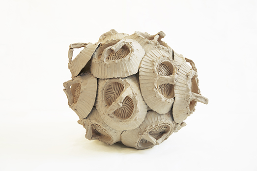 “Clay Time Code”, realizzata da Barbara De Ponti nel 2016, è caratterizzata dalla presenza di un materiale specifico risalente a 400 milioni di anni fa: l’argilla azzurra del Mare Pleistocenico. Attraverso un percorso a ritroso supportato da studi di geologia e micropaleontologia che le hanno consentito di ampliare la tradizionale scala di misurazione del tempo, De Ponti ha individuato alcuni microrganismi fossili e li ha resi protagonisti di una serie di sculture in ceramica che li riproducono in scala aumentata, utilizzando lo stesso materiale di cui originariamente erano fatti. Allo scopo di agire e stimolare l’inconscio dello spettatore seducendolo, spiazzandolo, comunque relegandolo a una condizione di incertezza e di impotenza di fronte alla natura, all’ingovernabilità dei suoi fenomeni. Dove l’esigenza storica dell’uomo di catalogare la natura, di ordinarla, razionalizzarla, si scontra ancora una volta con la sua incapacità di possederla.