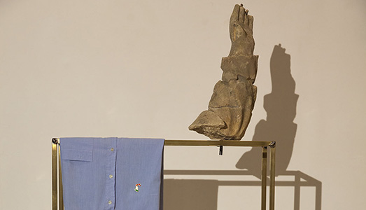 In alto: Fabio Ranzolin, Like victory without victorious, 2017, struttura in ottone, braccio in pietra vicentina di San Antonio (1759 circa), camicia firmata Valentino in cotone, spilla a forma di penisola italiana made in china, 157x70x20 cm