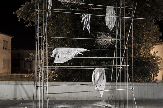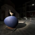 Il centro urbano della cittadina caudina coincide con il percorso espositivo. Che il visitatore è invitato a esplorare lungo un tragitto nel quale si può cogliere l’eco della storia del luogo, raccontata soprattutto dalle “tracce” che molti degli abitanti hanno lasciato nel silenzio del borgo irpino. E gli artisti hanno ripercorso queste orme e, cercando di inseguirle, ne hanno colto i simboli e le epifanie, la dimensione poetica e drammatica connaturata a quelle che sono le caratteristiche storiche del territorio: dalla devozione religiosa alla coltivazione del tabacco (l’opera di Umberto Manzo dal titolo “Attraversate dal vento del Sud” è un’alta struttura in ferro, simile agli essiccatoi del tabacco su cui venivano appese le foglie a fatte asciugare prima della lavorazione). Includendo temi di grande attualità, come quello dell’emigrazione. E non trascurando neppure la conformazione naturale dei luoghi. Eugenio Giliberti, per esempio, ha collocato su un muro laterale della chiesa di Rotondi un pannello in ceramica smaltata di due metri per due, raffigurante i corsi d’acqua e i fossi del territorio con l’aggiunta della loro riproduzione catastale. L’opera, dal titolo “R-H2O+”, si relaziona e richiama un intervento che parallelamente l’artista compie lungo un tratto del fiume Carmignano/Isclero, reso pedonale per l’occasione e accessibile entrando da un cancello su via Varco. È stato, inoltre, realizzato un sonoro che il pubblico può ascoltare passeggiando lungo il fiume con apposite cuffiette. Sulla facciata di un’abitazione privata Perino & Vele hanno, invece, realizzato un wall painting acrilico dal titolo onomatopeico e ironico “paMaronn” (nella foto in alto) ispirato al rituale del corteo dei fucilieri legato alla tradizionale processione della Madonna della Stella. Al centro della piazza della cittadina staziona, poi, la scultura di Lucio Perone “Il sogno dell’emigrante” (nella foto in home). Si tratta di un omino che, seduto sulla punta di una grande matita rossa, solleva una sfera bianca che emette un’intensa luce elettrica. È la metafora del viandante, del viaggiatore, dell’emigrante che ha caratterizzato la storia del territorio e che racconta la sua storia personale (la matita) e illumina il proprio cammino con la luce della speranza. Il grande uovo blu di resina “Lasciatemi pensare” di Giuseppe Perone, con sopra un’oca dalle dimensioni reali, vuole essere un omaggio alla tradizione rurale e ancora fortemente legata alla natura, agli animali e a un approccio primordiale e sentito con l’ambiente. Il rapporto con il passato insomma si fa così presente a Rotondi, e il presente vive di memoria che si fa attualità. (Cesare Biasini Selvaggi)