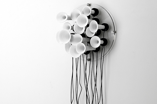 Roberto Pugliese, ottenuta la laurea in Musica Elettronica presso il Conservatorio San Pietro a Majella di Napoli, divide il suo tempo tra l’insegnamento, l’attività musicale e la produzione di installazioni sonore. La sua attività trae energia principalmente da due correnti artistiche, quella della sound art e quella dell’arte cinetica e programmata. Nelle opere esposte nello spazio scaligero, dalla grande “Emergenze Acustiche” – installazione di tubi in plexiglass e speaker – alla cascata di cavi audio “Unità minime di Sensibilità”, il suono si presenta sia come oggetto di ricerca, sia come mezzo di espressione acustica e visiva, per analizzare e stimolare la psiche e la percezione umana.