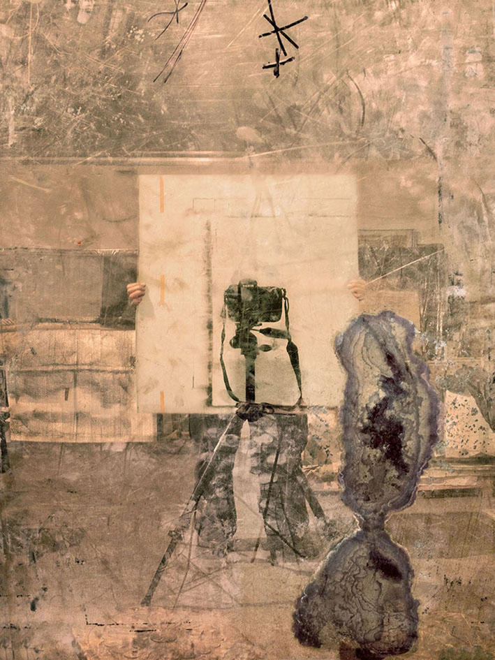 «Il percorso della mostra si apre con il dittico “Autoritratto”, dalla serie “Attraverso la traccia” (Bergamo, 2010) realizzato usando la superficie specchiante del retro di un ‘grande rame’ che, modificata dall’ossidazione del tempo, restituisce un’immagine alterata della figura. Un gesto simbolico l’intervento di Mario Cresci perché in questo caso è la fotografia a ‘incidere’ la lastra di rame: un omaggio a quello sperimentalismo che caratterizzò l’invenzione della fotografia fin dalla sua comparsa nel mondo dell’arte».