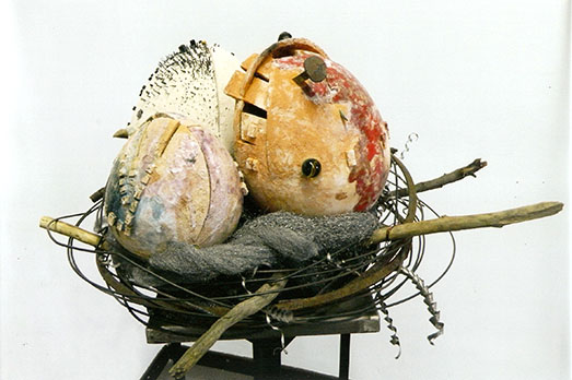 In alto: Claudio Rosi, Naso su naso, 44x32x170 cm, creta cruda indurente, plexiglas, smalto e acrilico, cera, 2017, Courtesy CasaGallery
