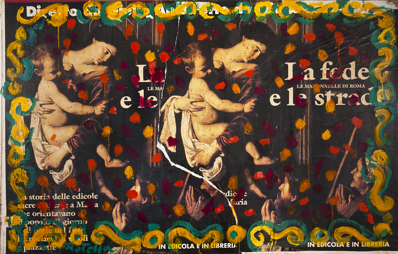«I lavori esposti – dai famosi décollages ai riporti fotografici, dagli artypos ai ready-made fino alle sovrapitture – raccontano l’inventiva di Mimmo Rotella, permeabile agli aggiornamenti, coinvolto senza timori nel dibattito artistico contemporaneo. In un gioco di rimandi capace di animare la curiosità dello spettatore e di sicura valenza didattica, si possono individuare i temi che percorrono trasversali la mostra: ad esempio, quello della bellezza femminile si dipana dalle forme canoniche della statua di Giovanni Battista Bernero nel riporto fotografico Italia (1963) a quelle sintetiche della sovrapittura Modigliani (1998), fino a Marilyn Monroe, icona mediata dallo sguardo pop di Andy Warhol in Senza titolo e dall’autocitazione in Come on (2005). Allo stesso modo il genio di Caravaggio è protagonista della sovrapittura Madonna dei Miracoli o dei Pellegrini (di Michelangelo Caravaggio) (1996) e di Quando arrivò Caravaggio (2005); la Gioconda di Leonardo è riletta attraverso Marcel Duchamp in chiave surrealista e dadaista nell’assemblage Senza titolo e nel collage Senza titolo (1972); il confronto con la generazione della Transavanguardia e del Graffitismo sta alla base di Folletto (1991) e La mostra di Sandro Chia (2000) », si legge nel comunicato stampa.