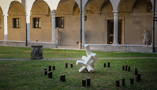 In alto: Caos vacilla, 2010, marmo e ferro, 100 x 300 x 200 cm, courtesy Famiglia Nagasawa, esposta nel chiostro della Soprintendenza