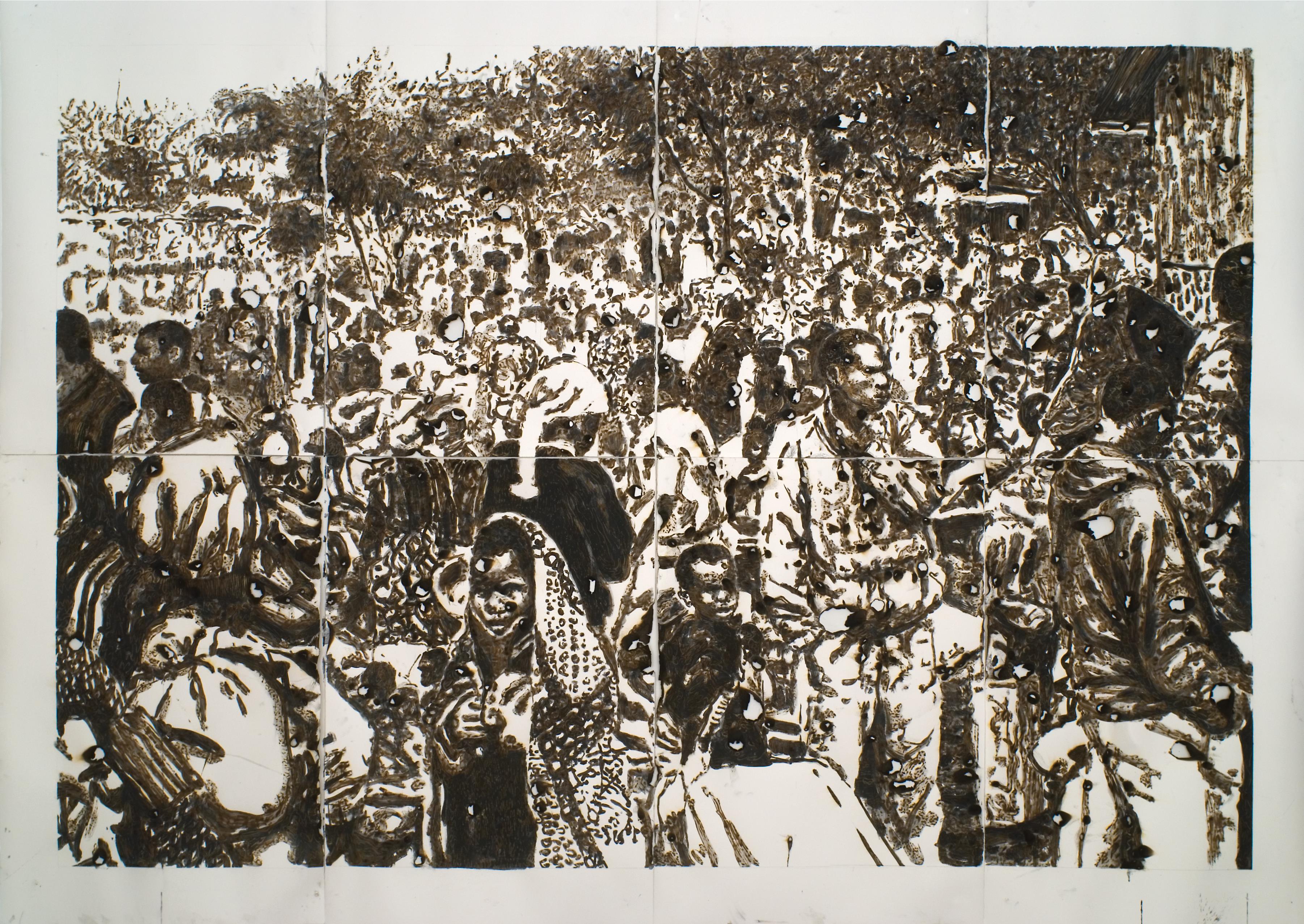 Palmyra è un importante telone fotografico nero, dipinto mediante candeggina e raffigurante l’immagine dei resti del teatro dell’antica città Palmyra (Syria), distrutto nel 2015 dai militanti Isis/Daesh. La candeggina che disinfetta, pulisce e rimuove il colore sulla tela nera richiama le bandiere del ex-califfato.