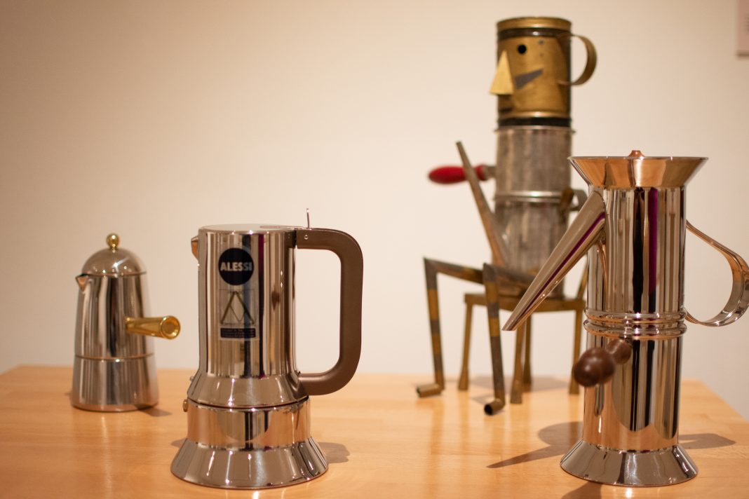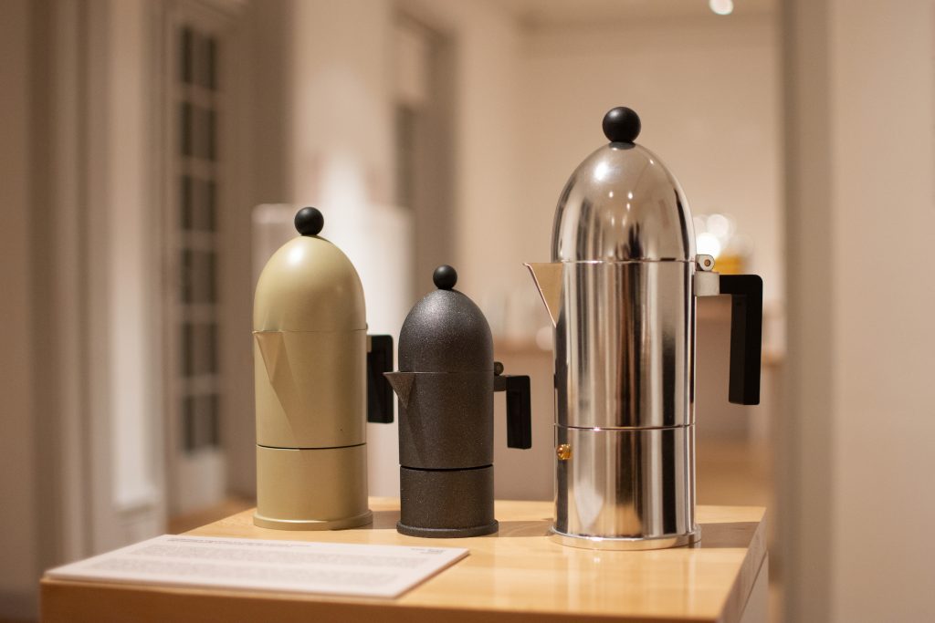 Elisabetta Pisu: «La mostra si svolge attraverso un percorso storico, una panoramica che abbraccia due secoli di evoluzione nella preparazione del caffè espresso. Si va dalle macchine da bar di noti marchi – Gaggia, Faema, La Cimbali – portatrici di tecnologie rivoluzionarie, alle caffettiere domestiche dei grandi maestri del design come Sottsass, Cini Boeri, Mangiarotti, Rossi e Sapper. Un nucleo importante dell’esposizione è costituito dagli oggetti per il caffè del famoso architetto Aldo Rossi: le iconiche caffettiere –La cupola, La conica e l’Ottagono– la cui forma prese ispirazione dall’effimera architettura galleggiante de Il Teatro del Mondo, costruita dallo stesso Rossi per la Biennale di Venezia nel 1980; il progetto Tea & Coffee Piazza, promosso nel 1979 da Alessandro Mendini insieme ad Alessi, a cui Aldo Rossi partecipa con un set dove le forme dei vari componenti in argento creano uno spazio urbano, una piazza, un teatro, un tempietto classico con un orologio inserito nel timpano».