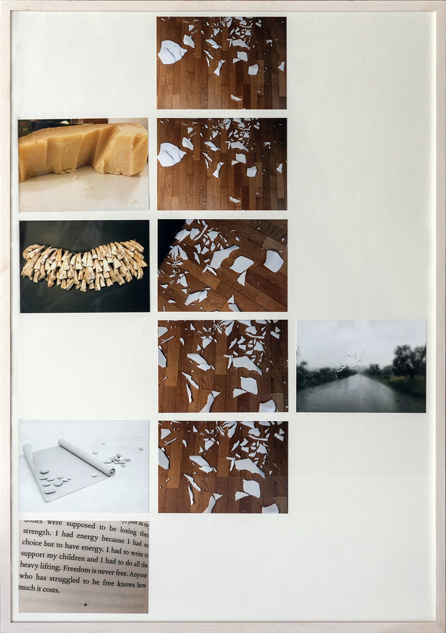 «All’interno del percorso artistico di Petra questi due nuclei di opere, pur essendo stati realizzati in periodi differenti, raccontano di una dimensione intima e personale, presente molto spesso nei suoi lavori. “Seclusion” è una serie composta da scarti di immagini pensate originariamente per un album familiare e rappresentano piccoli frammenti di vita dell’artista; i lavori su Travertino proseguono il discorso intimo dei collage attraverso le incisioni tratte da un libro di pensieri scritto dall’artista stessa».