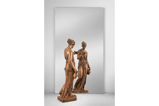 Un’attenta selezione che include Scultura di Chamberlain (opera che fa parte della serie i quadri specchianti) sottolinea i temi fondanti dell’intera carriera del Maestro: la costante ricerca di dare forma al passare del tempo catturando, nella bidimensionalità della superficie riflettente, la complessità e l’oggettività del reale. In questo senso lo spettatore viene incluso nella composizione in cui gli elementi statici, applicati alla superficie, contrastano con il dinamismo dei corpi in movimento. Il fruitore dell’opera diviene allo stesso tempo soggetto e oggetto della propria riflessione; protagonista che si integra con l’ambiente circostante e con l’opera determinandone l’aspetto performativo. Nel Dono di mercurio allo specchio questo rapporto diviene ancora più significativa facendo entrare in gioco l’elemento scultoreo. La vergine si erge a termine di confronto per lo sguardo che osserva se stesso in relazione alla dea a sua volta riflessa nello stesso specchio. Un autoritratto del mondo come immagine ribaltata e distorta in cui la simmetria viene invertita impedendo di osservarci come gli altri ci vedono.