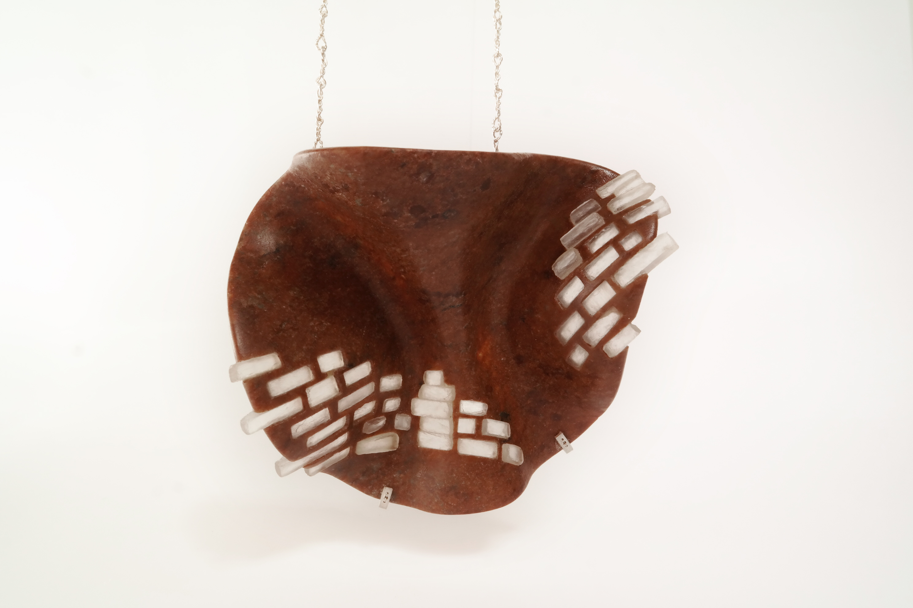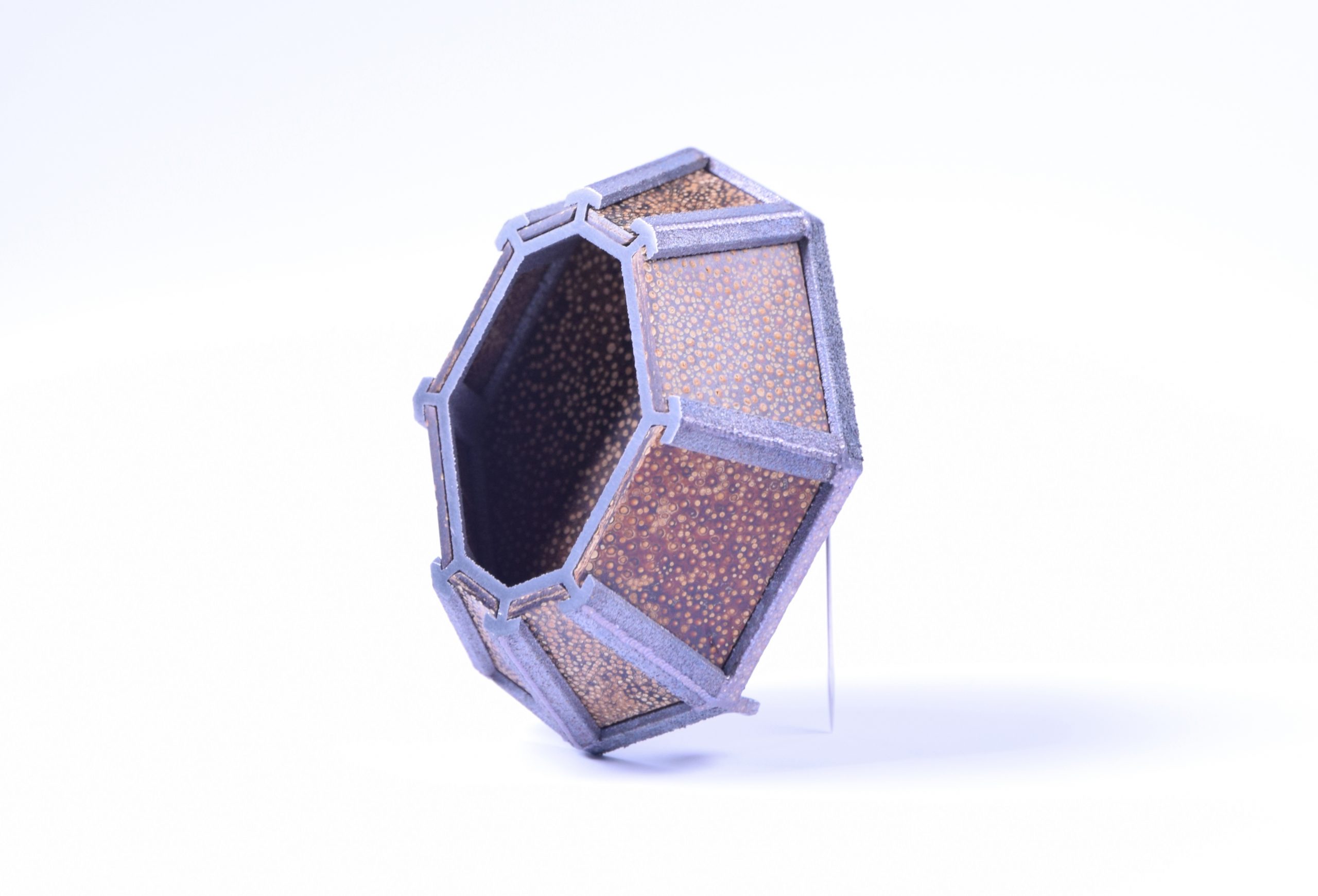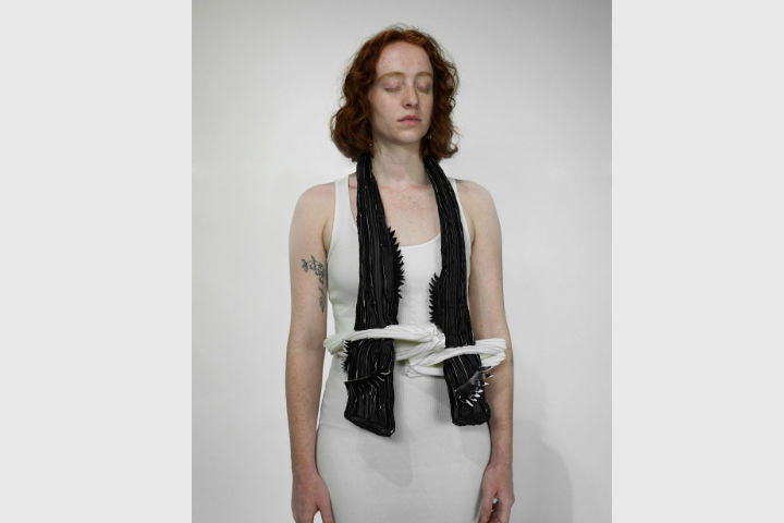 «È una giovane designer di gioielli inglese. Ha studiato Design 3D, Argenteria e Gioielleria, laureandosi alla Loughborough University nel Regno Unito, con un Master in Oreficeria, Argenteria, Lavorazione dei metalli e Gioielleria al Royal College of Art di Londra. La serie “Sha-green” presenta i rifiuti alimentari sotto forma di scorze di agrumi scartate, biodegradabili, come alternativa vegana all’omonimo shagreen, impiegato nell’industria del lusso. Questo materiale profumato prende vita quando è indossato: riscaldato dal corpo, esso emette una sottile fragranza fruttata».