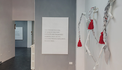 Il percorso di “Arrangements & Haze” negli spazi della galleria bolognese racconta le molteplici possibili manifestazioni del corpo, secondo il collettivo, tramite otto suggestivi testi poetici, ancora una volta tatuati su grandi ritagli di pelle bianca. Verrà presentato anche un nuovo corpo di opere inedite: uno studio di prototipazione rudimentale per la costruzione di oggetti fragili, sciamanici, crudi e immaginifici che si presentano come amuleti votati alla diffusione della speranza come strumento critico, in un universo unico e immaginario. Lunghi titoli rappresentativi completano le opere dandogli un valore aggiunto sostanziale.