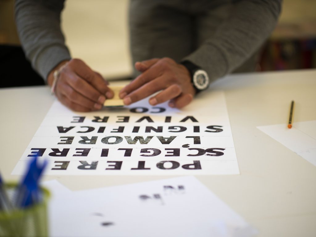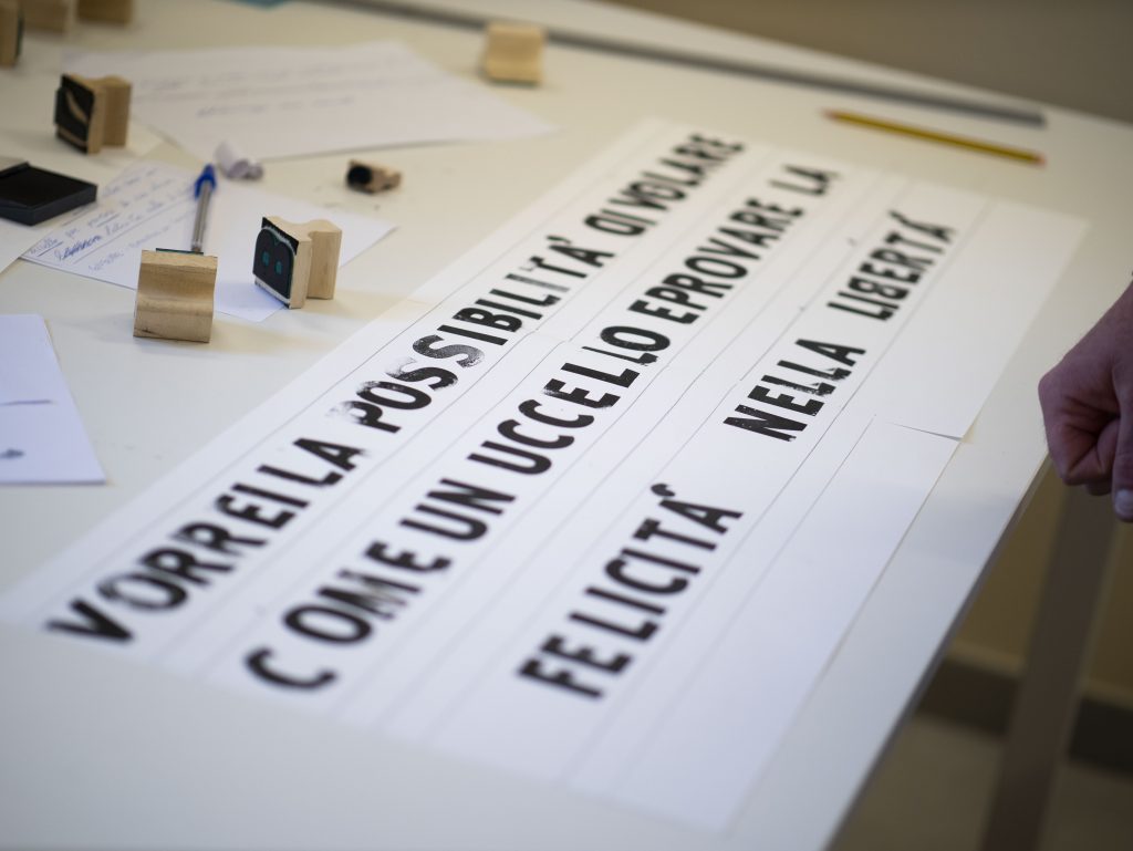 Dall’insegna luminosa Volare per una farfalla non è una scelta, all’omonima maglietta che ospita la frase-manifesto del progetto, elaborata dal gruppo il primo giorno di lavoro; dall’installazione Il buco nella rete, composta di strisce di tessuto su cui sono raccolte le frasi sulla libertà realizzate dal gruppo misto dei partecipanti, le cui parole fluorescenti, appositamente illuminate, aprono nuove prospettive, a Il Tempo che rimane, sorta di tenda che scandisce il tempo in parti uguali, ospitando modi diversi di rappresentarlo e di interpretarlo graficamente.
