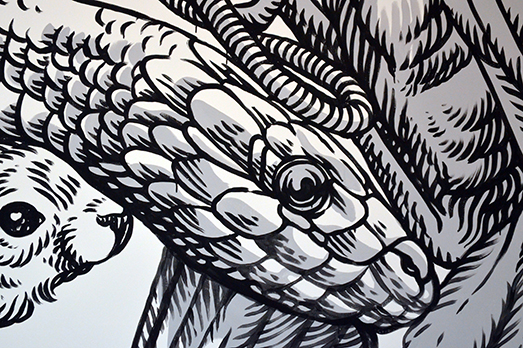 Ha fatto innamorare ricchi e potenti, benpensanti e borghesi, anche se è stata concepita al di fuori delle convenzioni sociali e, per lo più, illegale, per strada, sui muri dei palazzi, sulle sopraelevate, tra cemento, degrado e povertà. In quartieri-ghetto, banlieue. Da artisti ribelli, in un limbo tra vandalismo ed esperienza creativa al servizio della comunità. Oggi, invece, è di casa nelle sale delle gallerie private più cool e dei musei maggiormente ortodossi, così come tra gli stand delle fiere internazionali o nelle showroom esclusive delle case d’asta. Sto parlando di quel linguaggio artistico che viene definito e inglobato sotto il nome di “Street Art”. Incredibile protagonista, pertanto, di una favola simile, per magia, solo a quella di Cenerentola. Con tanto di lieto fine in un castello incantato. Anzi, nel nostro caso, in una reggia dorata. Quella di Caserta. Dove, infatti, si inaugura oggi una collettiva di Street Art, curata da Pia Lauro, con interventi site specific di Halo Halo, Lucamaleonte (nella foto in alto), Rero, Sbagliato (in homepage), 2501. Il titolo della mostra, “Room Service”, ovvero “Servizio in camera”, suggerisce l’idea di un accesso privilegiato a spazi privati, la possibilità di svelare realtà tenute nascoste e riportarle a una dimensione pubblica. Una riflessione che nasce dal fascino di un ambiente museale fortemente caratterizzato dalla sua storia, che si fa luogo di indagine sul presente attraverso l’interpretazione degli artisti. Le stanze nelle quali è allestita la mostra sono le retrostanze degli appartamenti storici del XVIII secolo, luoghi di passaggio, ma anche spazi nei quali sovrani, corte e servitù potevano vivere una quotidianità autentica, liberi dalle sovrastrutture e dalle convenzioni sociali.