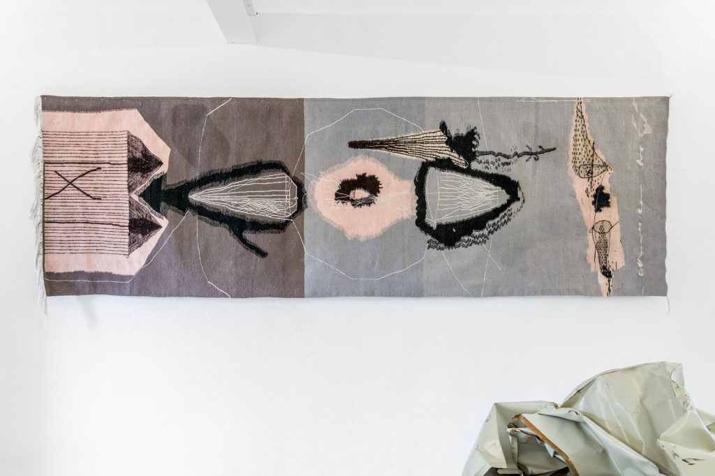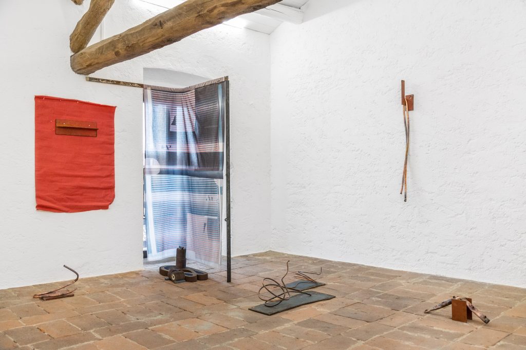 È ricorrente nella mostra l’immagine del cerchio: definito nella scultura in metallo al piano terra (The carpet is on order. It cannot be put down until the ceiling is re-done, 2023), intuitivo nell’altra scultura in metallo (Are we all the time going forwards and not backwords?, 2023), disegnato nel corridoio sul monumentale arazzo Tall, handsome, and speaks some German (2023), ed evocato in lavori si carta vetrata e rame al piano superiore come My increased attempt to solve problems myself (2023). All’immagine del cerchio, traducibile concettualmente in termini di circolarità, sono legati i concetti di rigenerazione e trasformazione, nonché di rinascita e reincarnazione, che Entwistle considera come un potente processo contro il determinismo individualista e culturale.