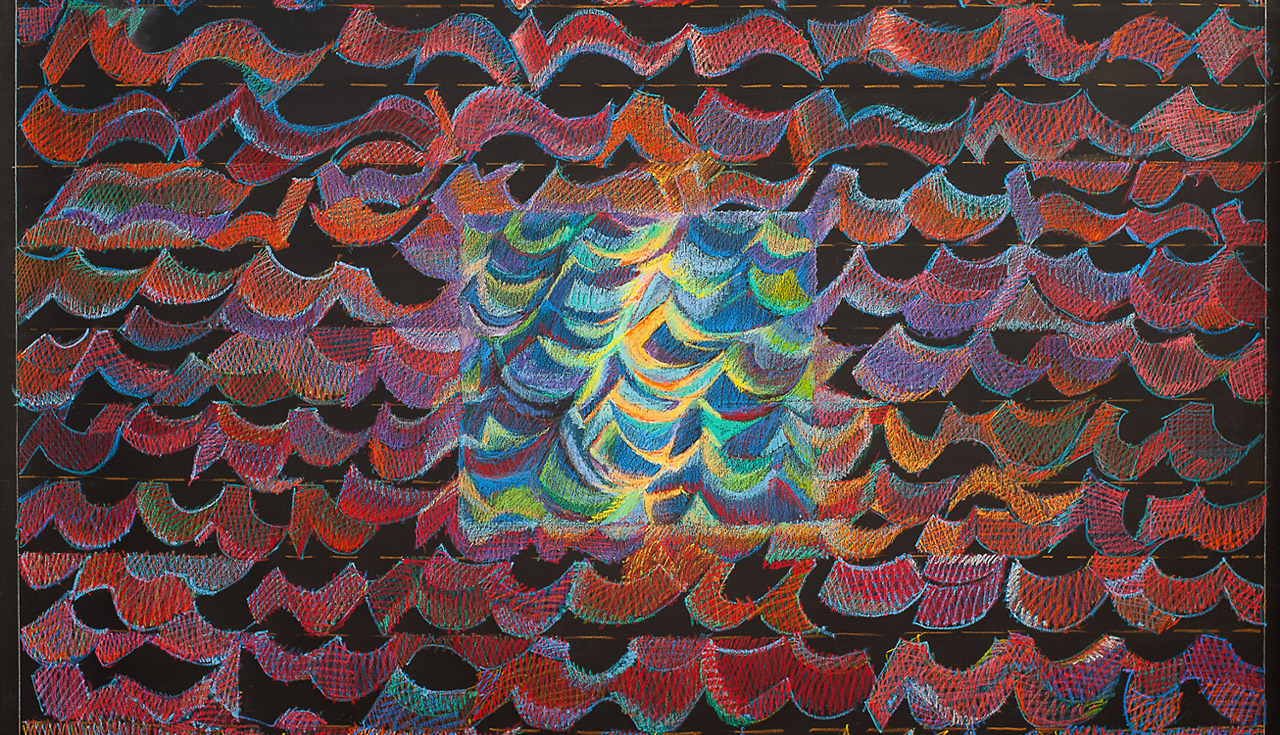 «Dipingere con le parole – continua la galleria – è il tema ricorrente dell’opera della Weller. Le parole sono scelte per la loro brevità e la loro particolare grafia. Per esempio: erba, alba, mare, grano. Usando pastelli a olio e sovrapponendo abilmente i primari con i complementari, la Weller riesce a creare una sorta di texture di cui si comprende l’efficacia solo guardando l’opera da lontano. Al tempo stesso queste parole vengono trattate sia in modo microscopico sia in modo macroscopico. Esemplare, in questo senso, l’apertura della mostra con un’opera del 2014 intitolata “Plenilunio”. In questa tela l’artista si serve appunto di una scrittura formata da moduli macroscopici che dovrebbero mimare frammenti di una parola simbolo come potrebbe essere mare.»