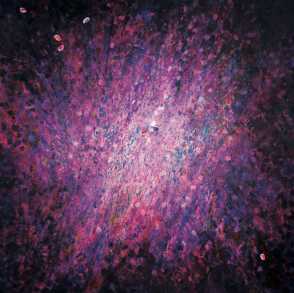 «In mostra ci saranno molte opere mai esposte prima, tra cui due grandi tele della serie “Sullo sfogliar del fato”, in cui i petali sono i protagonisti in una fase in cui la natura rappresenta un appoggio imprescindibile per la meditazione. Diverse opere della serie “Con-Centro” del 2020 sono quadri di notevoli dimensioni, in cui l’artista allude a quel “giusto mezzo” (golden mean), il centro interiore dell’essere umano. La serie “La Luce Prima” è rappresentata da tre lavori, di cui uno di grandi dimensioni, ed è caratterizzata dalla presenza all’interno delle opere di lampade di wood».
