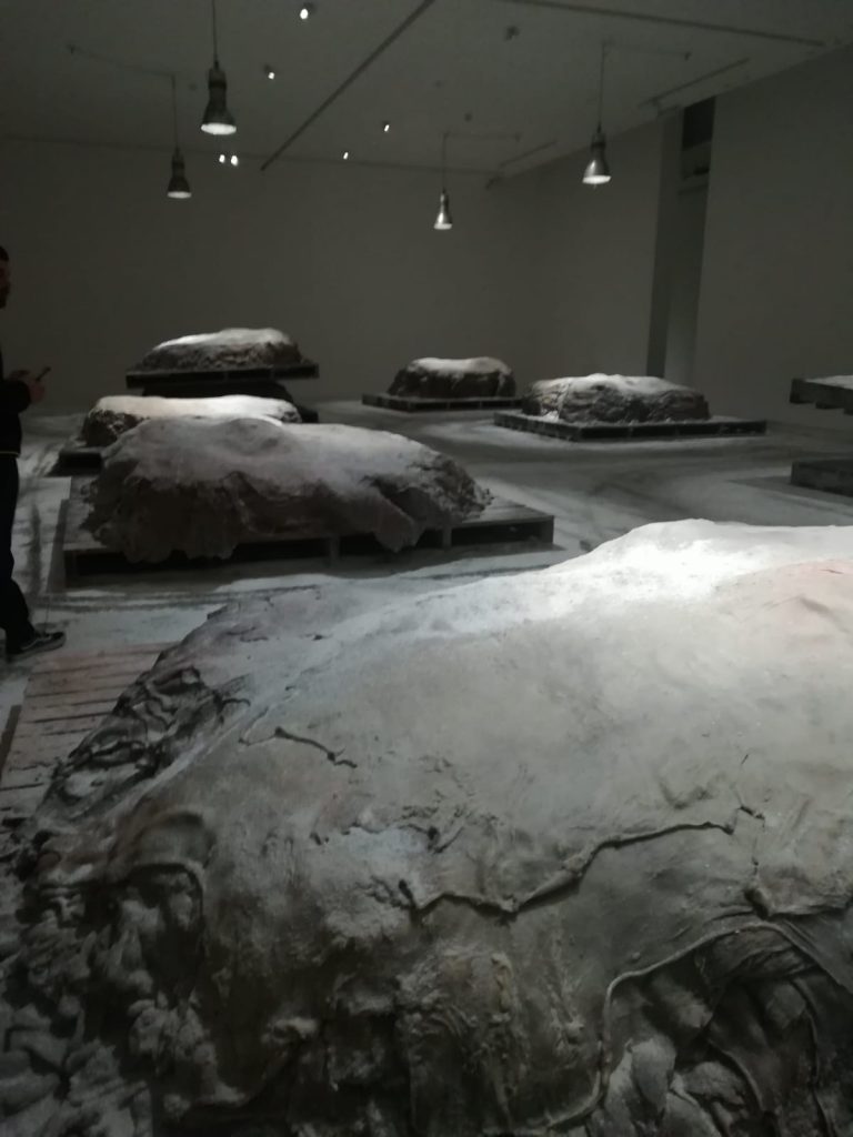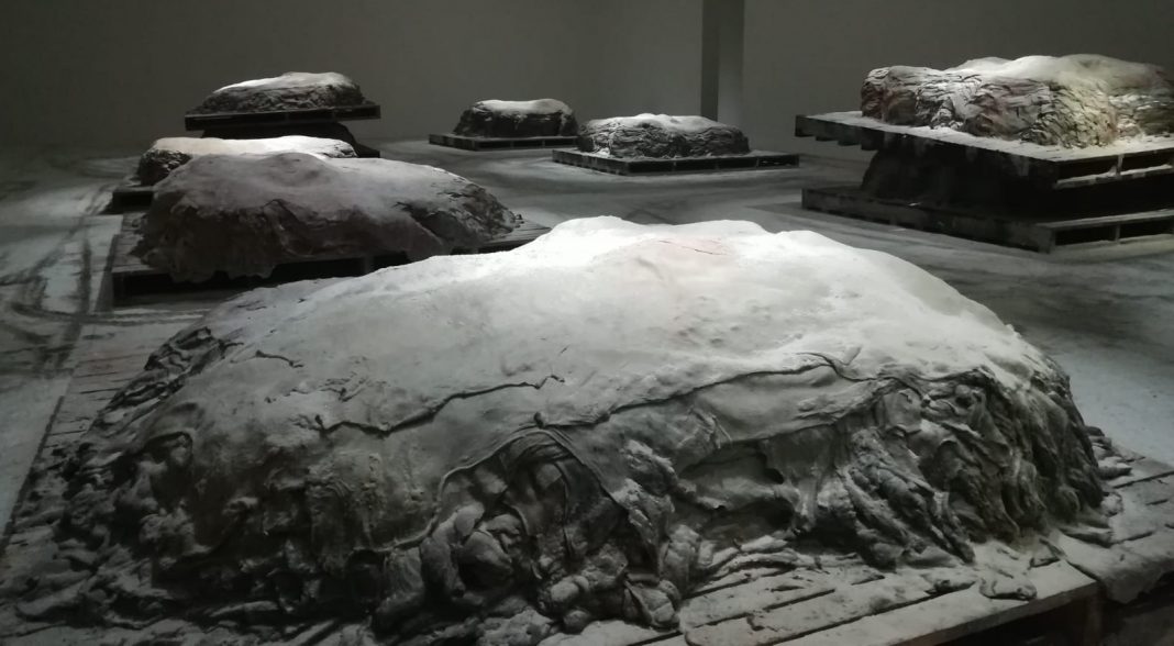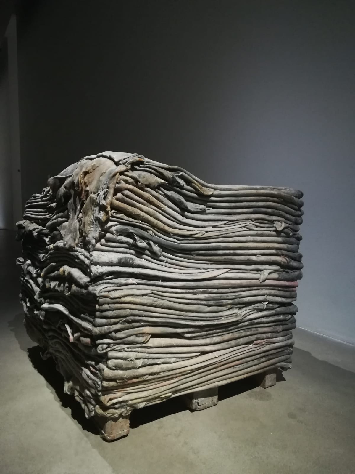 Da questo livello di fusione tra astrazione e brutalità, si passa ad incontrare poi l’installazione nello spazio principale: ci si avvicina alle pile che espongono in modo chiaro l’elemento della pelle piegata, che costituisce un approccio molto più delicato.