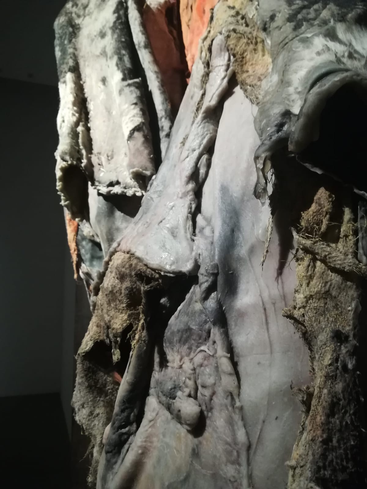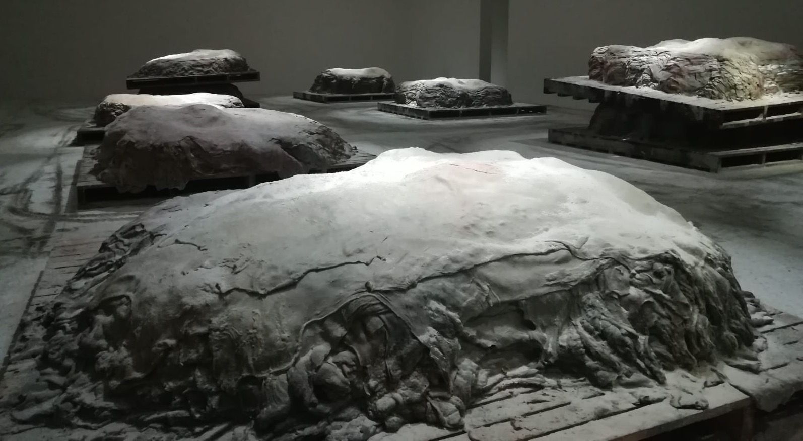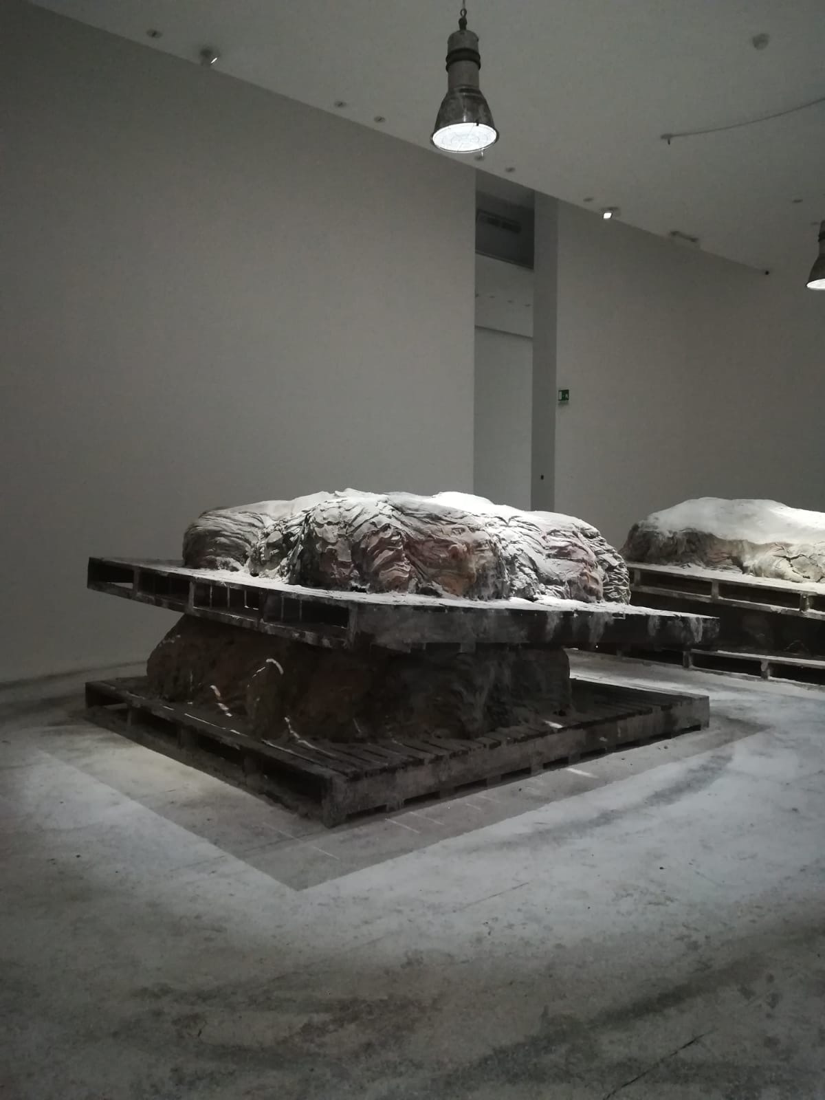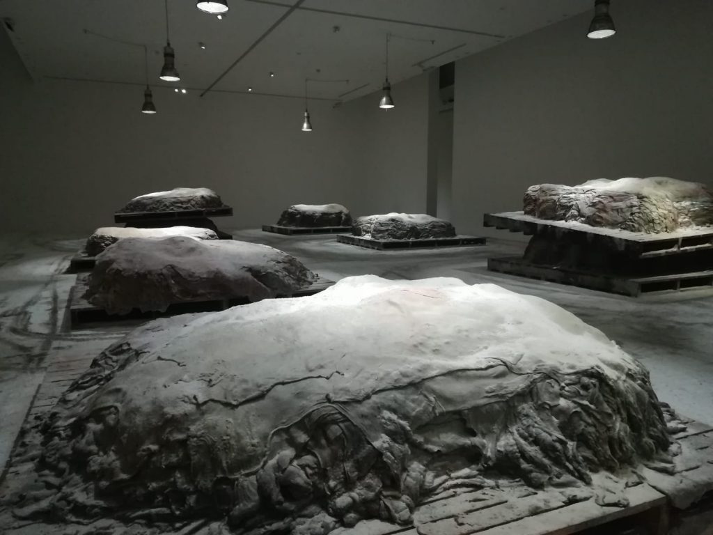 «Questa forte consapevolezza della dualità della vita e della morte è un elemento che ho voluto traslare in questa mostra in molti modi diversi, affrontando diversi livelli di trasformazione. Questo è forse più tangibile nelle serie di pile di pelli nel corridoio: le prime che si incontrano sono le più difficili da decifrare, potrebbero essere calchi in cera di formazioni rocciose, o tessuti compressi, c’è perfino una “strizzatina d’occhio” all’Arte Povera.
