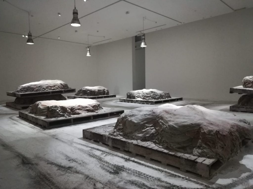 Nello spazio dell’installazione l’elemento del sale è molto importante in questo senso. Sebbene il sale sia qualcosa che possiamo percepire come un elemento invadente, in particolare in relazione alla pelle (“to rub salt in the wound”) [letteralmente strofinare il sale sulle ferite, l’equivalente dell’italiano “girare il coltello nella piaga”, ndr], qui io percepisco che la presenza del sale collega la brutalità delle monumentali pile di pelle a un’immagine di pace e quiete, di tranquillità. Le pile di pelli salate si trasformano in un paesaggio coperto di neve. Questo permette all’osservatore una moltitudine di esperienze, di interpretazioni: da qualcosa di molto oscuro e inquietante a qualcosa di sereno».