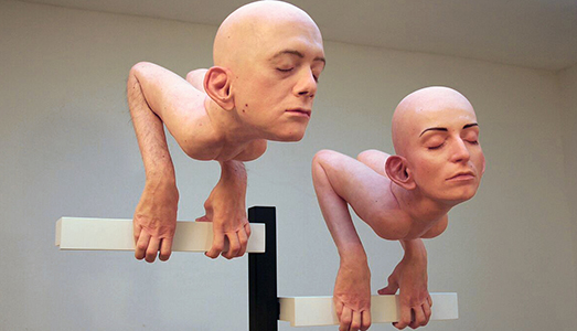 Partiamo da Roma. Partiamo da White Noise Gallery che, dal quartiere di San Lorenzo, si trasferisce in pieno centro, nel cuore di uno dei quadrilateri dell’arte contemporanea a Roma, inaugurando una programmazione più coraggiosa e concettuale, di matrice fondamentalmente installativa. E la prima scelta è caduta su personalità dense e affascinanti, profondamente interessate a tematiche avveniristiche, come le più innovative terapie geniche e il microcosmo degli esperimenti sul genoma umano. Le loro opere sono l’inquietante esito di uno studio approfondito sulle scienze più attuali, riflessioni che sfiorano complessi dibattiti sospesi tra bioetica, biotecnologie e l’ambiente. Sto parlando di Sara Renzetti e Antonello Serra, il duo sardo noto come i Santissimi, che inaugurano questo pomeriggio nella galleria romana “Rebirth”. Con sculture a misura umana (che così diventano specchio riflesso dello spettatore) di corpi indeboliti e crudelmente imperfetti, portatori sani di deformazioni emotive e fisiche. Corpi dagli occhi chiusi e il volto impassibile. Da due teste umane sorrette soltanto dalle corrispettive braccia aggrappate a un trespolo, in posizione da volatile.