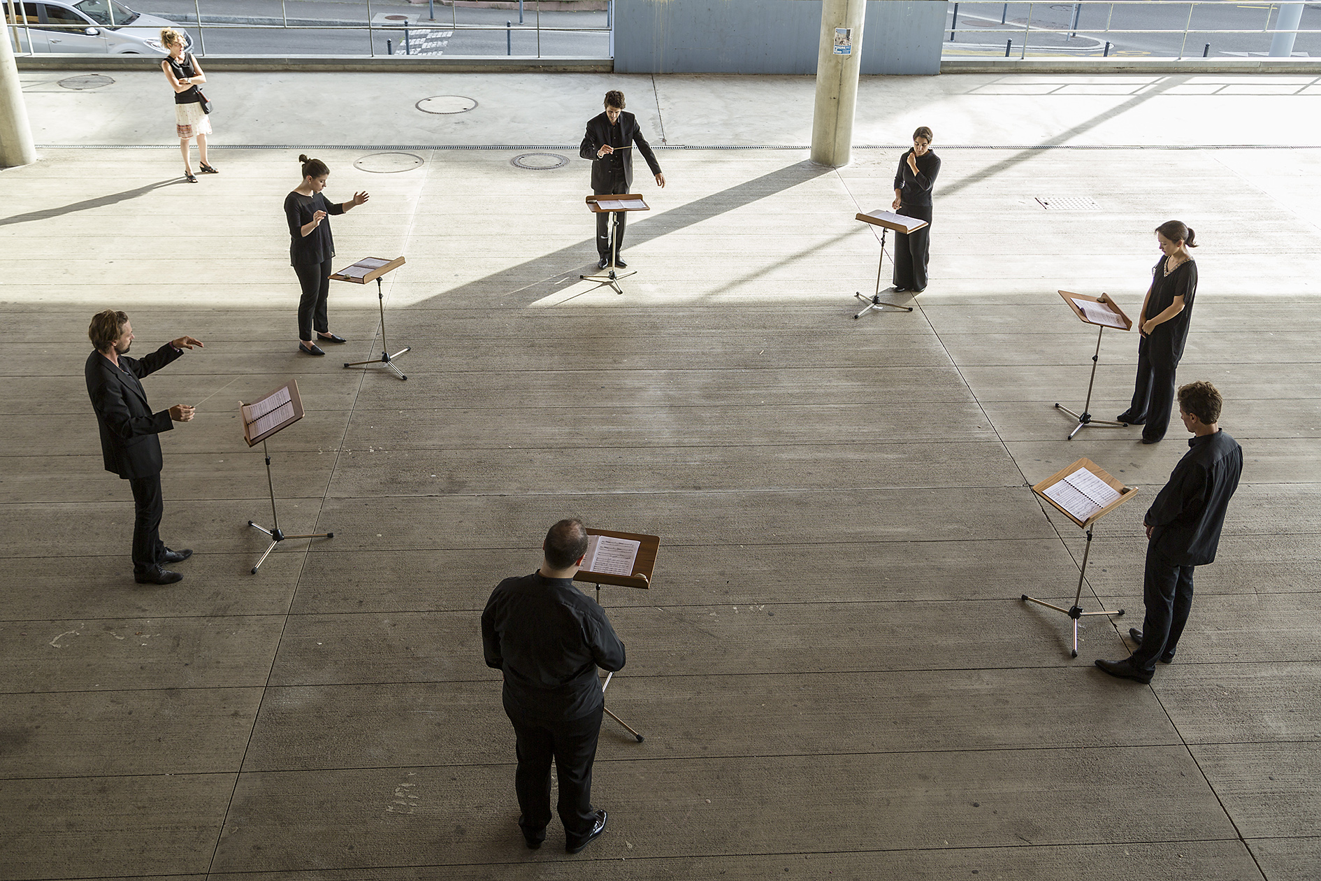 I direttori si fronteggiano disposti in cerchio, mentre il pezzo viene interpretato e tradotto dai gesti, dalle espressioni facciali e dalle tensioni che ognuno di questi sette corpi, con padronanza prossemica, indirizza di norma verso la propria orchestra. Ma i musicisti non sono presenti, ogni direttore dirige la partitura interpretando il brando per un proprio ensemble invisibile, come in un elegante montaggio di possibili realtà, tutte condensate nell’arte di un individuo», ha spiegato l’organizzazione.