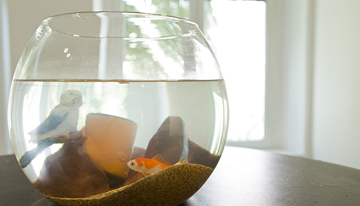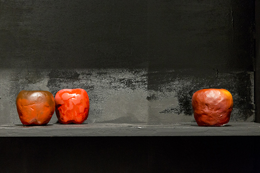In alto: Matrioska con pesce, 2017, olio, acrilico, legno, ceramica, piastrelle, polistirolo, resina, das, boccia di vetro, pesce rosso, carta, (dettaglio). Photo: Francesco Basileo, courtesy: smART – polo per l’arte