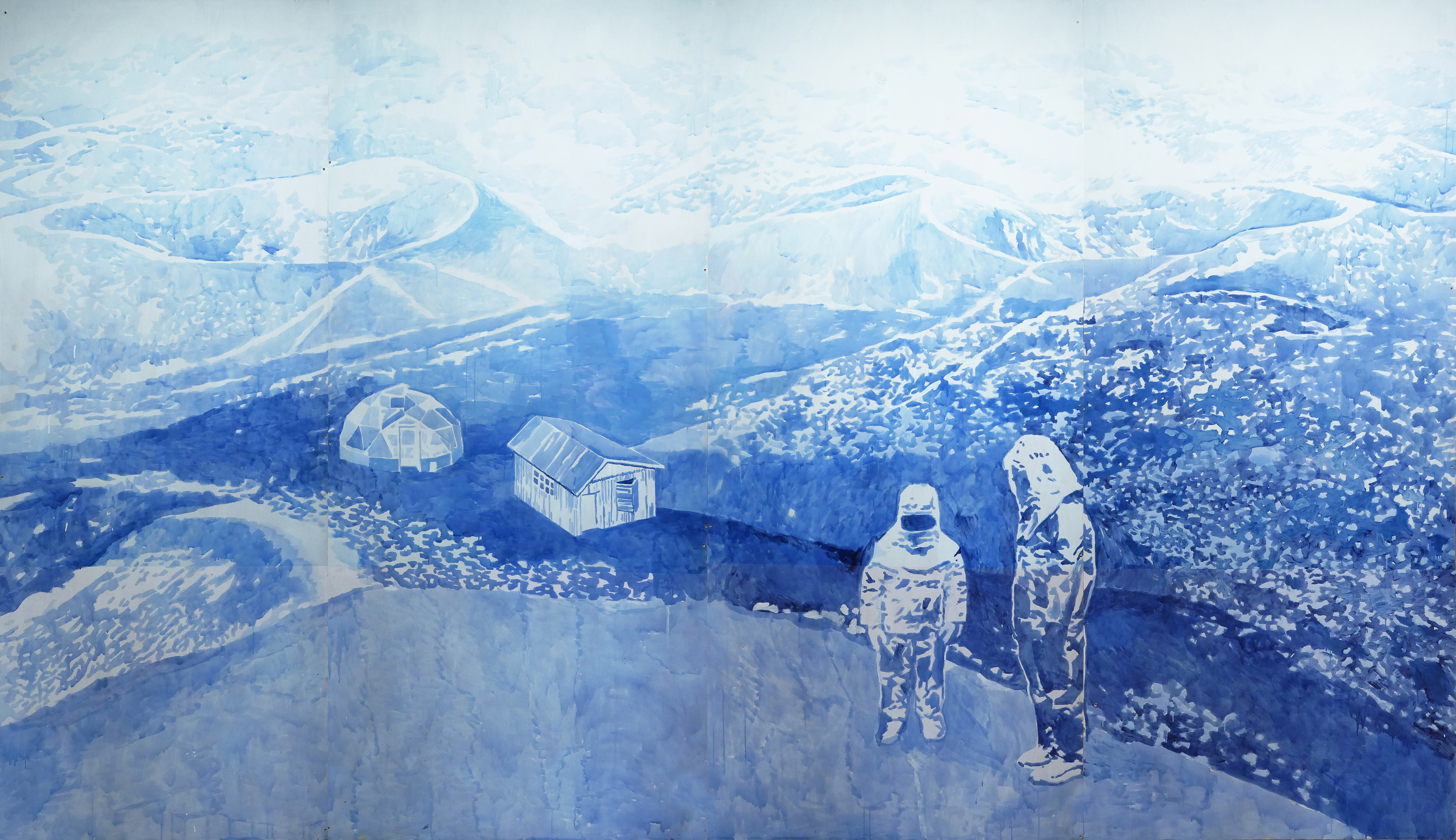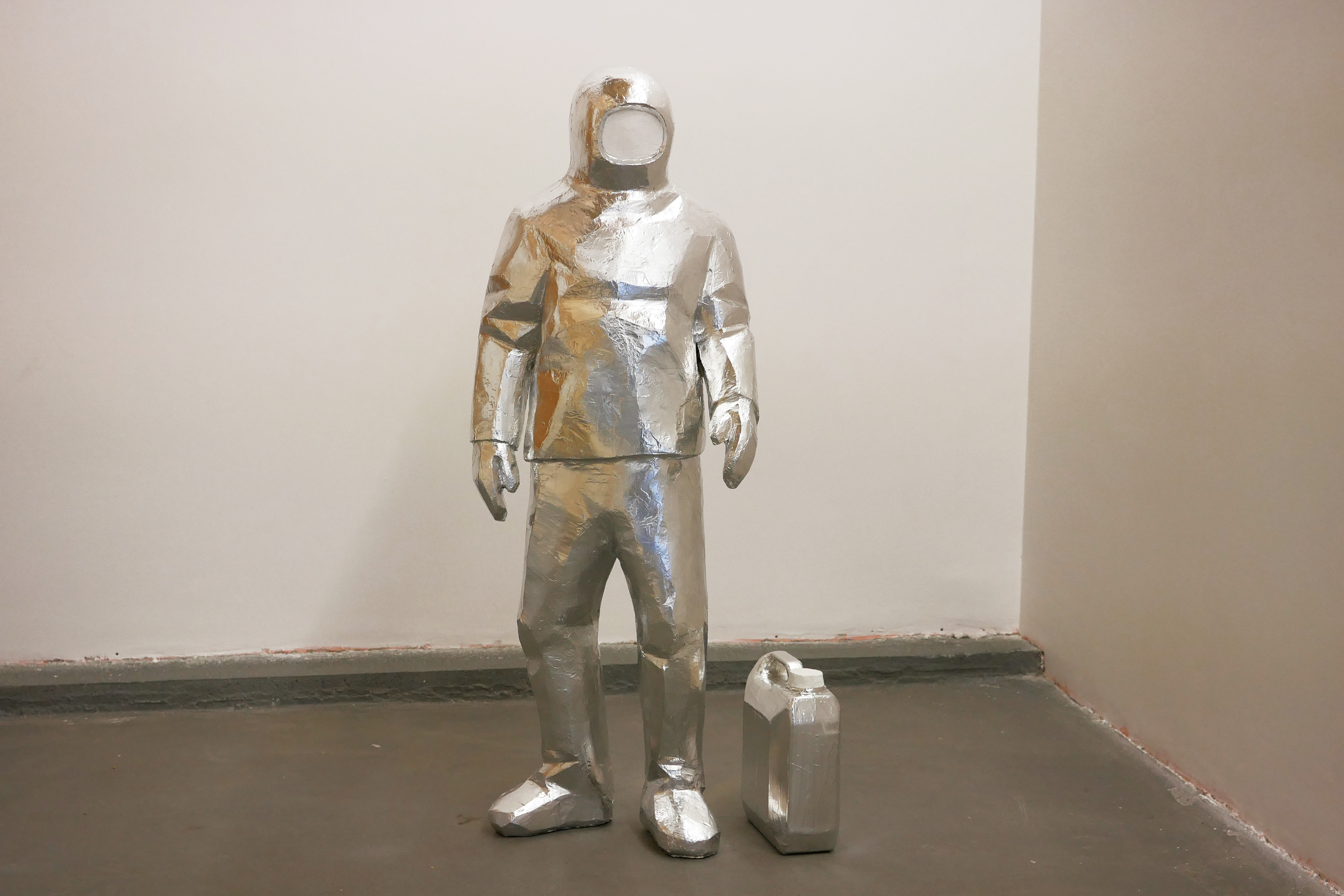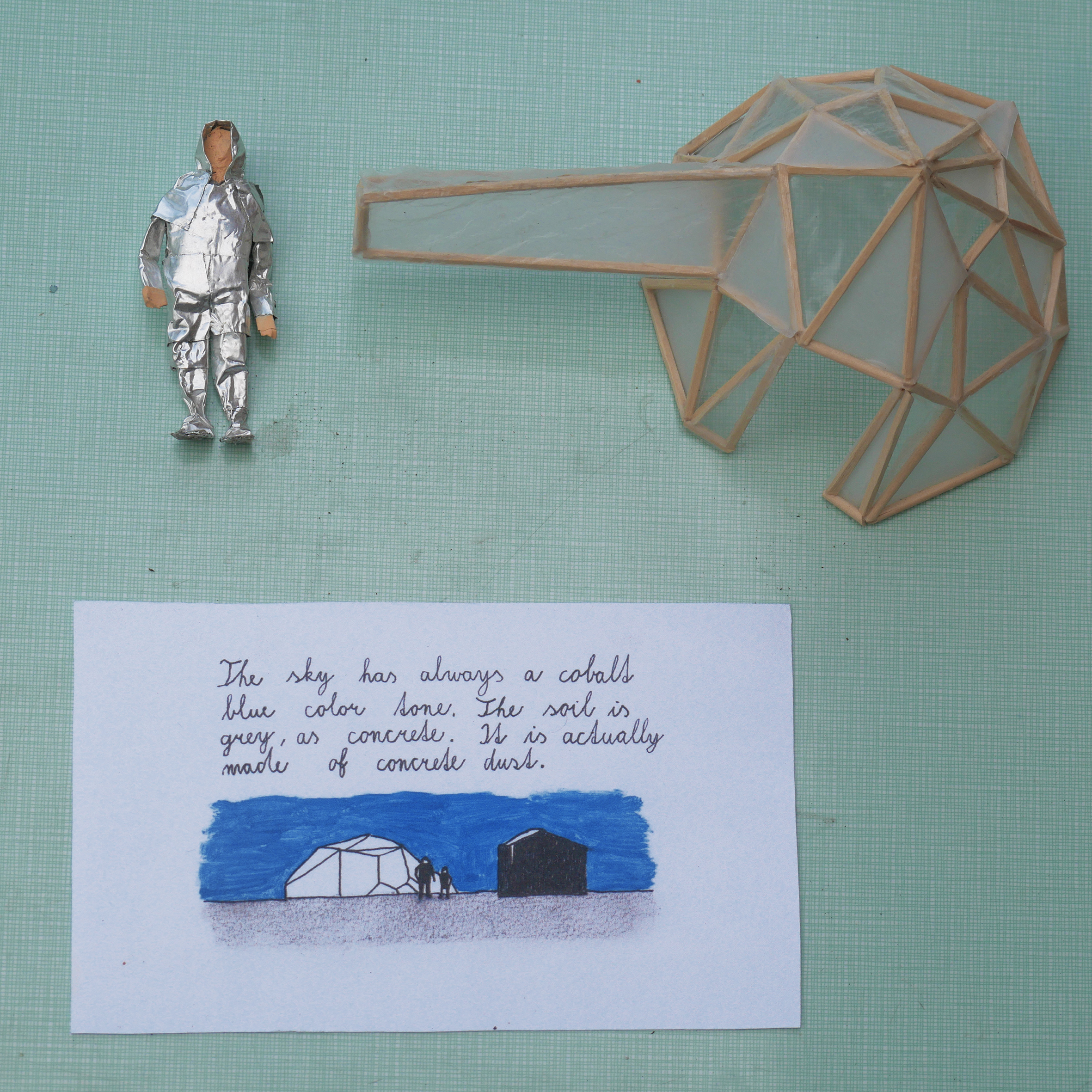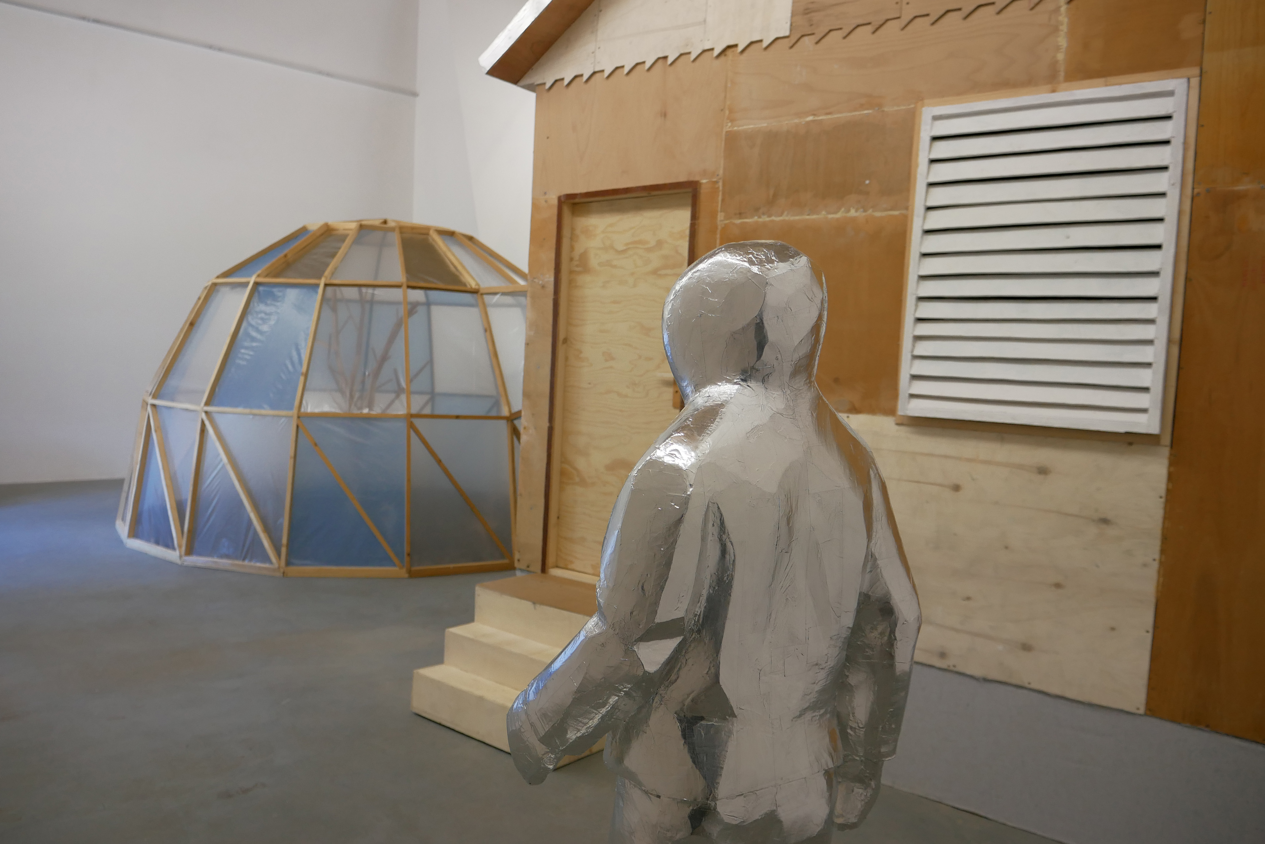 «La mostra è costruita intorno alla storia di un uomo e una bambina che vivono in questo ambiente futuro. Racconta la loro lotta quotidiana contro le alte temperature, l’aria polverosa e irrespirabile, le tempeste di vento senza precipitazioni e le sostanze tossiche in una terra devastata dall’attività umana. La storia descrive anche come tutto è cominciato: i cambiamenti all’inizio erano impercettibili, quasi inavvertiti; gli insetti scomparvero gradualmente dal paesaggio, il tempo cambiò più rapidamente, le estati divennero insopportabilmente calde, gli inverni sorprendentemente freddi, le inondazioni e gli incendi furono più frequenti. Con il tempo, la terra si trasformò in una terra desolata e inospitale. Un video animato mostra la vita quotidiana dei due protagonisti della storia – probabilmente gli unici sopravvissuti – mentre si muovono attraverso l’arido paesaggio in tute protettive. Fortunatamente, il vero cottage nel giardino dell’artista a Košice non è un sistema chiuso, ma un luogo di vita usato da una comunità di amici come giardino e spazio espositivo spontaneo, con piani futuri per ospitare residenze di artisti. I disegni, i dipinti di oggetti e vari oggetti naturali che documentano la vita del duo fittizio all’interno del cottage, collegano la realtà vissuta con la finzione, i cui confini si confondono in uno sguardo più profondo», ha spiegato AlbumArte.