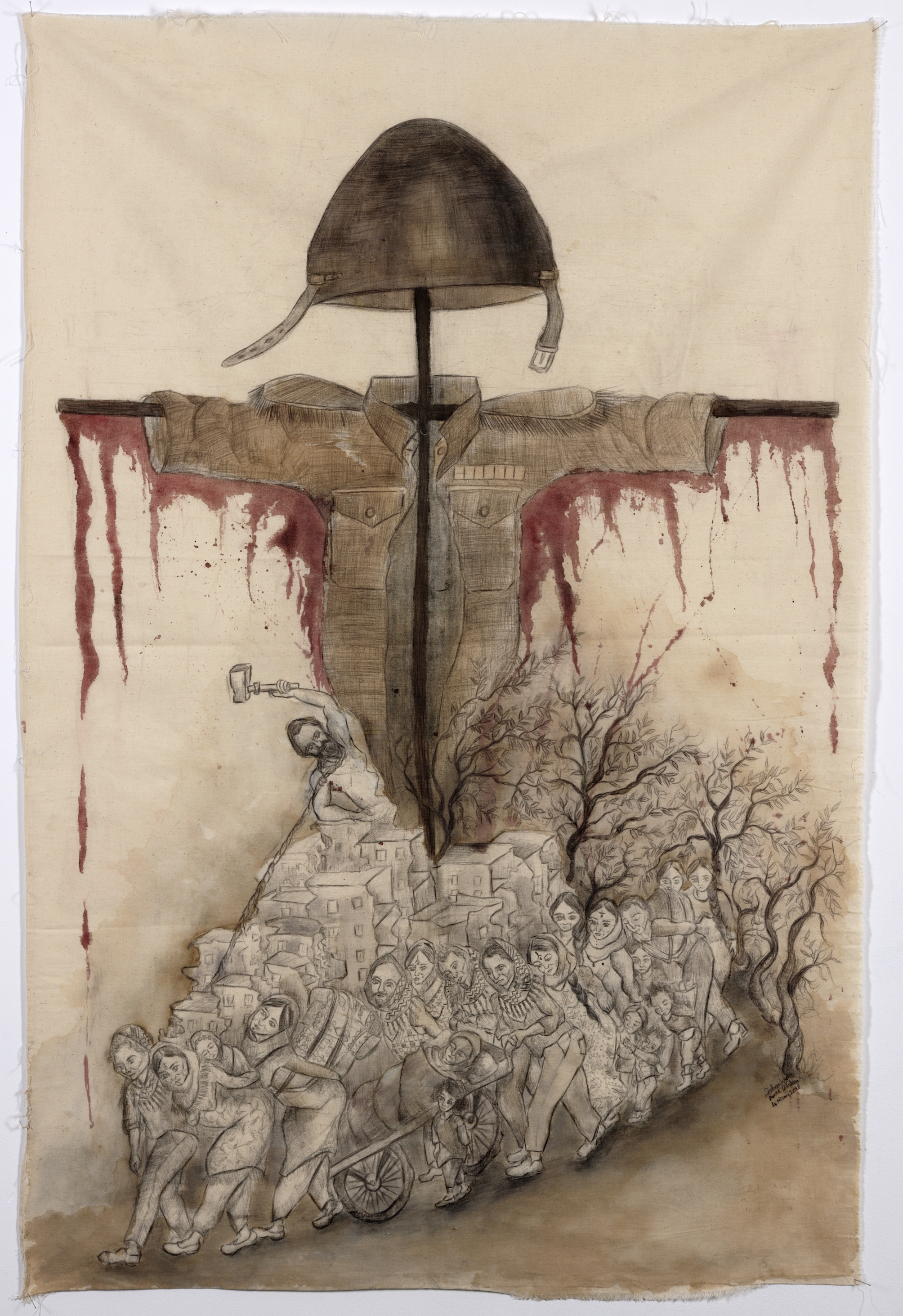 «Ci sono sessanta opere, realizzate su supporti diversi (brandelli di lenzuola, carta da pacchi, stagnola da pacchetto di sigarette…) di cui cinquantasei provenienti dalle carceri turche. Le opere sono state trasferite in modo rocambolesco in Europa e conservate da Kedistan in Francia. Sono suddivise in tre sezioni: macchie, corpi, politica. Nell’ultima stanza ci sono anche quattro lavori realizzati a Londra dopo il suo auto esilio e la camicia con le scritte e i disegni che le detenute le hanno fatto prima del suo rilascio. Si tratta di un percorso dal forte impatto emotivo».