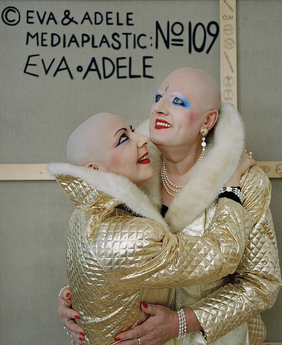 Si identificavano come «Hermaphrodite twins from the future» e ambasciatrici del futuro giunte a Berlino con una macchina del tempo dopo la caduta del Muro. EVA & ADELE erano apparse sulla scena dell’arte all’inizio degli anni ’90, arrivando a piedi dal futuro alla Biennale di Venezia del 1991: un atto performativo che le consacrò immediatamente come creature al di fuori del tempo, né maschile né femminile, incarnazione di un’utopia queer portata avanti con grazia ma anche con disciplina.