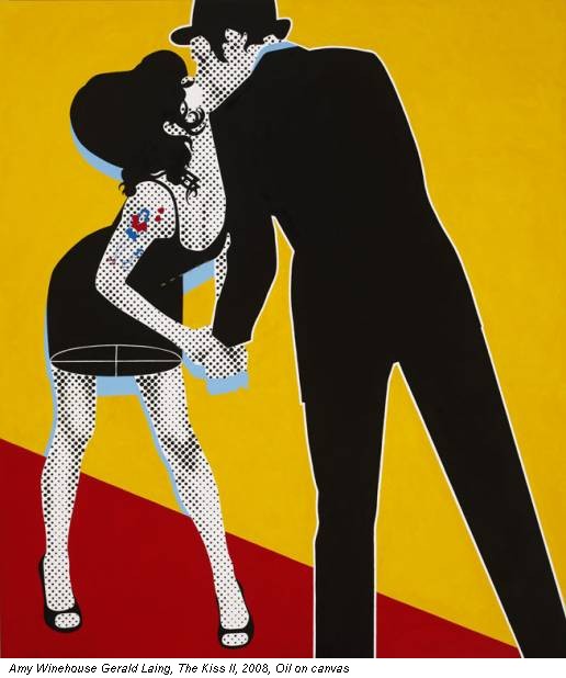 La mostra dal titolo New Paintings for Modern Times riprendeva l’iconografia Pop, – dalle sagome stilizzate, le ampie campiture di colore ed, a tratti, il riapparire del retinato della stampa, così nella migliore tradizione Pop angloamericana – aggiungendo a quell’iconografia la scelta tipicamente british di proporre una koiné inglese fatta di star non celebrate dall’universo statunitense, quali Brigitte Bardot e Anna Karina, cui aggiungere una star della musica (oltre, come dicevamo, una star e del costume). In altre parole, quell’immaginario nato con This is Tomorrow, alla Whitechapel di Londra, del 1956, riprendeva la musica, espressività centrale del Pop inglese, in una nuova versione femminile. Dopo i Beatles di Peter Blake, ora Amy Winehouse nelle opere di Gerald Laing. The Kiss è certamente una delle più note delle opere di Laing dedicate alla Winehouse: Amy è presa da un bacio appassionato, spontaneo con Blake Fielder-Civil, allora ancora suo marito, già in carcere per un’aggressione provocata in un pub ed aver ostacolato “il normale corso della giustizia”. Un bacio romantico, rubato in uno scatto fotografico da un paparazzo per una rivista scandalistica. Insomma un contesto Pop perfetto per una anti-star. Quell’amore si è trasformato in una tortura, come nelle migliori tradizioni delle Star americane (Marylin su tutte). Blake l’ha denunciata per stalking a causa delle centinaia di sms che gli inviava nel tentativo di ricomporre una relazione compromessa dalla droga e dall’alcol. Uno stato depressivo che molto probabilmente si cela al fondo della sua precoce morte intercorsa ieri sera (23 luglio) nella bellissima casa di Camden Square. Una donna disperata e passionale, Amy Winehouse, e al contempo istrionica, divertente, ironica, diversa anche nel modo di cantare con voce profonda e graffiante, che le è valsa il paragone con figure femminili della jazz e soul molto diverse tra loro, quali ad esempio Sarah Vaughan e Macy Gray. E’ difficile pensare a lei come ad una icona Pop. E’ difficile che una cantante lo sia. Lo sono certamente Madonna, Lady Gaga, in quanto donne di spettacolo; è particolarmente complicato incarnare l’aura della Star in un vero talento musicale.Amy Winehouse lo era. Era un talento naturale. Ha esordito da giovanissima con un gruppo divertente in stile rap, che lei stessa definiva le Salt ‘n’ Pepa in versione bianca ebraica: le Sweet ‘n’ Sour, as Sour. E poi il passaggio alla musica colta: rhythm and blues della migliore tradizione con forti venature jazz e soul. Quindi, una icona per l’arte, malgrado un’immagine del tutto priva di qualità estetiche ricercate o di brama di “fama”, come nella migliore tradizione cinematografica.
