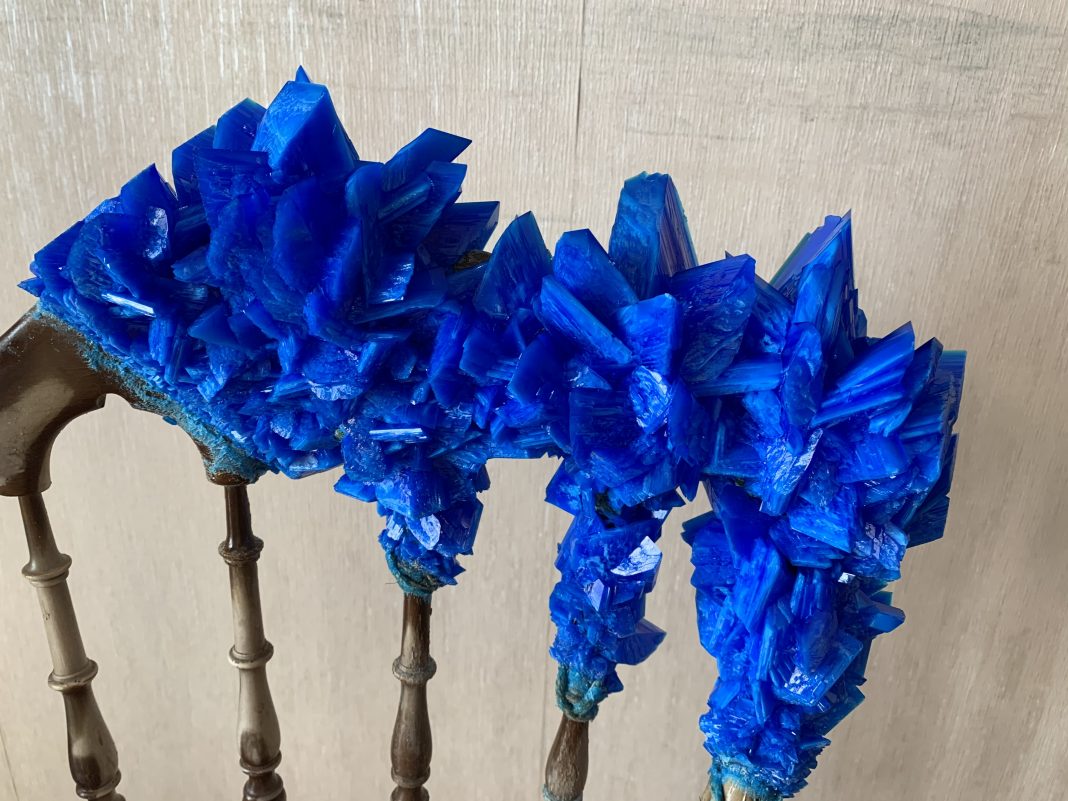 «Sono arrivata gradualmente alla cristallizzazione, tra le varie tecniche che utilizzo nella mia ricerca. Lavoravo già da anni con materiali naturali come i crini di cavallo, gli esoscheletri di cicale e i rami spinosi. A questi elementi tra l’organico e il vegetale sentivo la necessità di aggiungere anche il mondo minerale. Ci pensavo oramai da tempo ma, come spesso mi capita tra l’idea iniziale, lo studio e poi la realizzazione effettiva dell’opera, possono passare anche diversi anni. Non sapevo quasi nulla di chimica e, dopo alcune ricerche, ho scoperto che potevo produrre e sviluppare io stessa degli elementi minerali attraverso le procedure di saturazione e precipitazione di alcune soluzioni. Il tutto si sposava perfettamente con la mia passione per l’alchimia, sia da un punto vista filosofico che chimico, e anche a una parte della mia ricerca artistica che riguarda la leggera perdita di controllo sul risultato finale dell’opera d’arte. Ho così iniziato a far letteralmente “crescere” i cristalli sulle mie sculture spinose. I tempi di cristallizzazione sono molto lunghi, e per completare una sola opera possono volerci mesi interi. Per questo i primi lavori con questa tecnica li ho iniziati nel 2015, ma sono riuscita a esporli solamente nel 2017 in una mostra nella quale gli elementi vegetale, minerale e organico si fondevano dando vita a opere totalmente naturali.