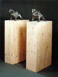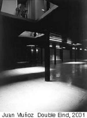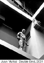 febbraio 2002, e non è dato sapere -per il momento- se l’evento della improvvisa morte dello scultore spagnolo modificherà questa data.. “Double Bind” è un’installazione giocata sul filo sottile delle apparenze e delle incomprensioni quotidiane, e che si avvale di una molteplicità di spunti, anche tecnici – dalla scultura all’architettura, dalla scenografia all’installazione – fondendo il tutto attraverso la dimensione unificante, ma sempre sfuggente, del grottesco e dell’incongruo. All’interno dell’opera due ascensori in moto perpetuo svelano al visitatore, già frastornato da un pavimento costellato da grandi sprofondamenti, alcuni reali e altri illusori, uno spazio surreale, animato da figure umane dall’aspetto equivoco, sarcastico ed indefinibile.