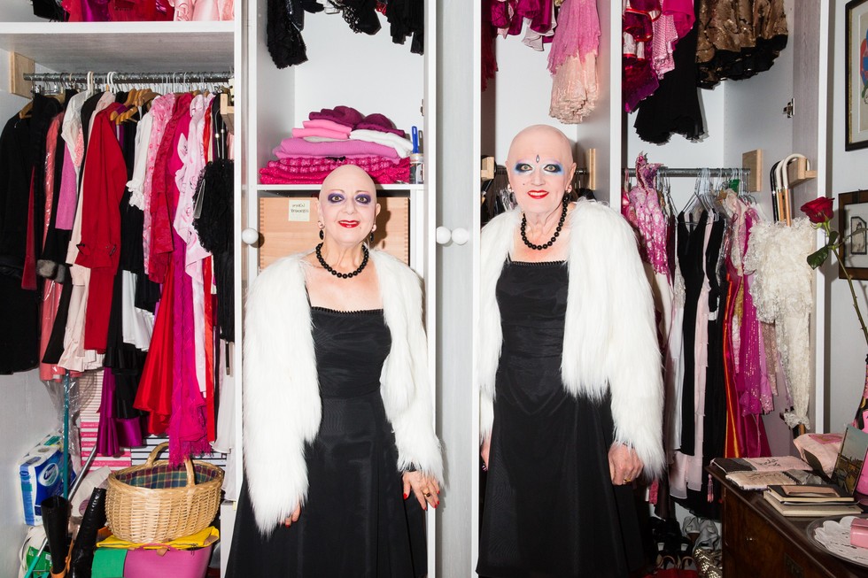 È una freddissima giornata dell’inverno berlinese, EVA & ADELE ci accolgono con un calore d’altri tempi nel loro appartamento-studio nel quartiere di Charlottenburg. Elegantissime in un vestito bianco e nero, ci accompagnano da una stanza all’altra, dove bon ton, ordine e precisione si uniscono ai colori sgargianti delle loro opere. Qui la parola d’ordine è “FUTURING”, il neologismo da loro creato all’insegna del quale da oltre trent’anni portano avanti una multiforme ricerca che ha come elemento fondante una performance che coincide con la loro vita, dagli aspetti più quotidiani ai gala nei grandi musei. EVA & ADELE non rivelano i loro nomi di battesimo, né il loro anno di nascita, preferiscono definirsi hermaphrodite twins from the future e ambasciatori del futuro giunti a Berlino con una macchina del tempo dopo la caduta del Muro. Loro “sono la loro performance” completamente fusa con la vita, che con essa coincide anche per durata, in cui operare artistico e esistenza personale non sono scindibili: realizzano assieme ogni opera, non si mostrano mai in pubblico l’una senza l’altra, né senza essere perfettamente truccate e abbigliate in modo identico anche nei dettagli e non rilasciano mai dichiarazioni che non siano espressione di entrambe. Tra gli esiti “tangibili” della loro ricerca ci sono anche numerose performance all’aperto con abiti appositamente realizzati, centinaia di dipinti, disegni, video e fotografie che insieme costituiscono un ricchissimo archivio.