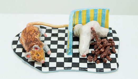 Una grande installazione cinetica è il polo d’attrazione della seconda personale del duo Eva Hide, dopo un esordio a Bari nel 2014: un totem accosta l’alta definizione di ex voto sessuali, realizzati in lucida maiolica dipinta (nella foto in homepage e in alto), alla bassa definizione degli altri elementi che concorrono a comporlo, in un collasso di registri estetici differenti. Una struttura di travi di legno non verniciato, figlia di un bricolage sfacciato e senza ambizioni estetizzanti, si pone al centro dello spazio carica di vistosi pezzi di carne offerti al pubblico, appesi a fili neri come avanzi di marionette scomposte: piedi, seni, peni, un addome, un orifizio anale. Una struttura aliena e arcana, evocatrice delle offerte negli antichi santuari dedicati ai culti di divinità ctonie che si credeva potessero esercitare poteri di guarigione.